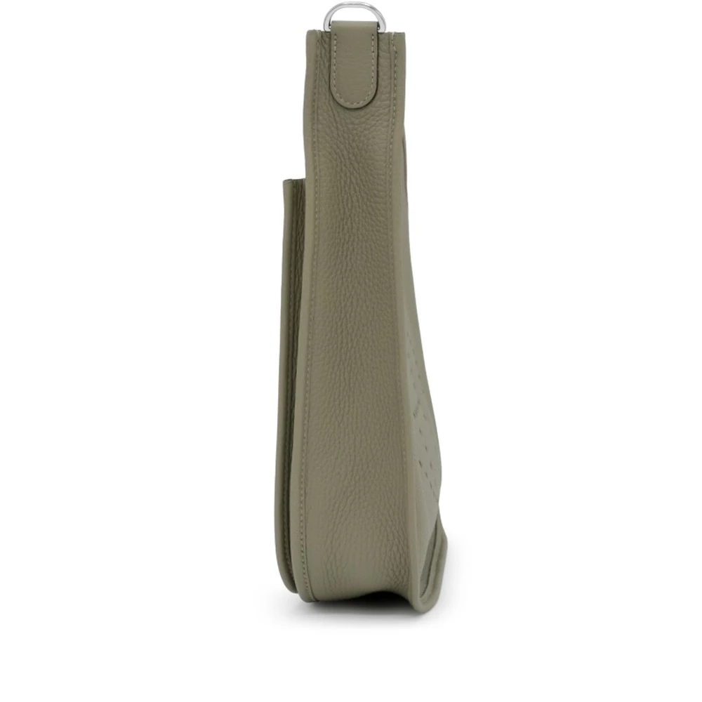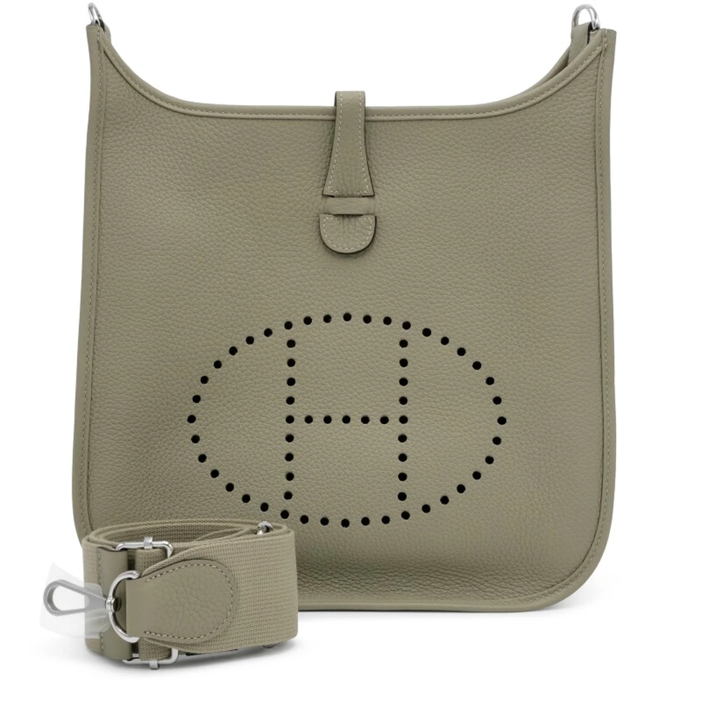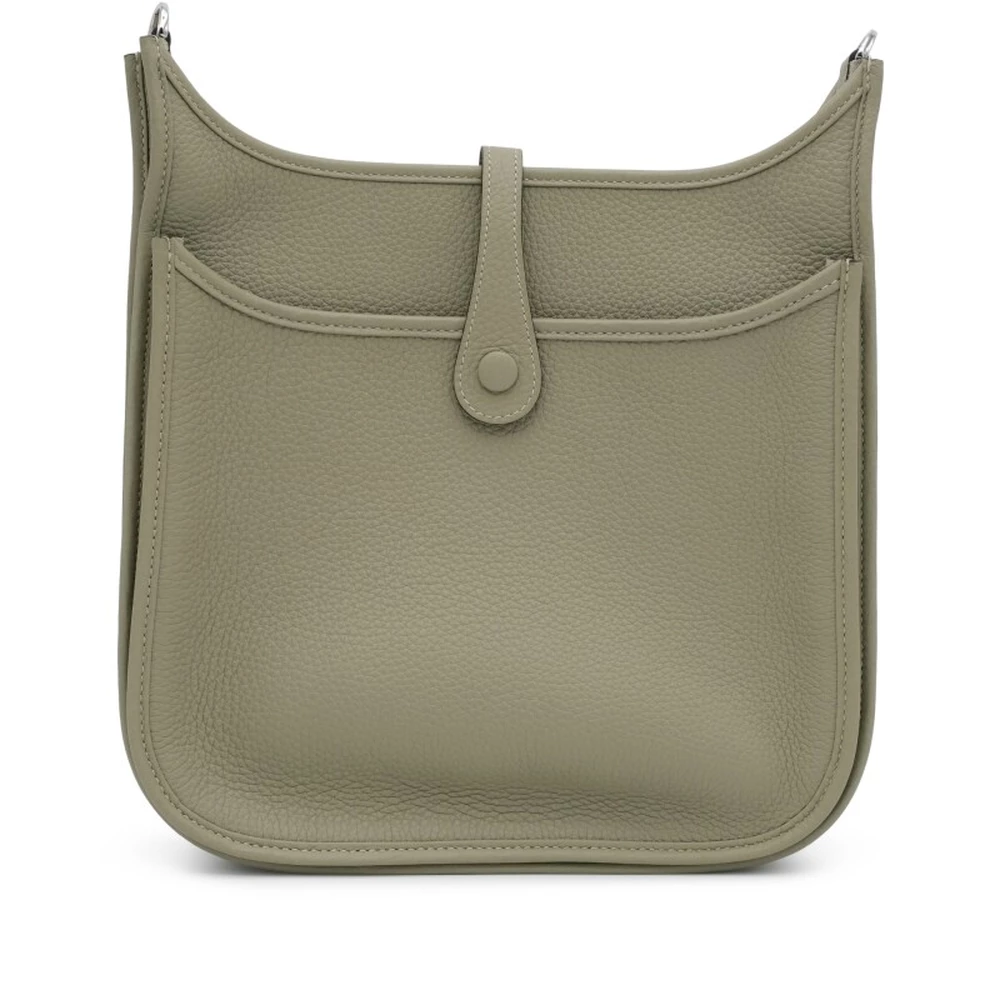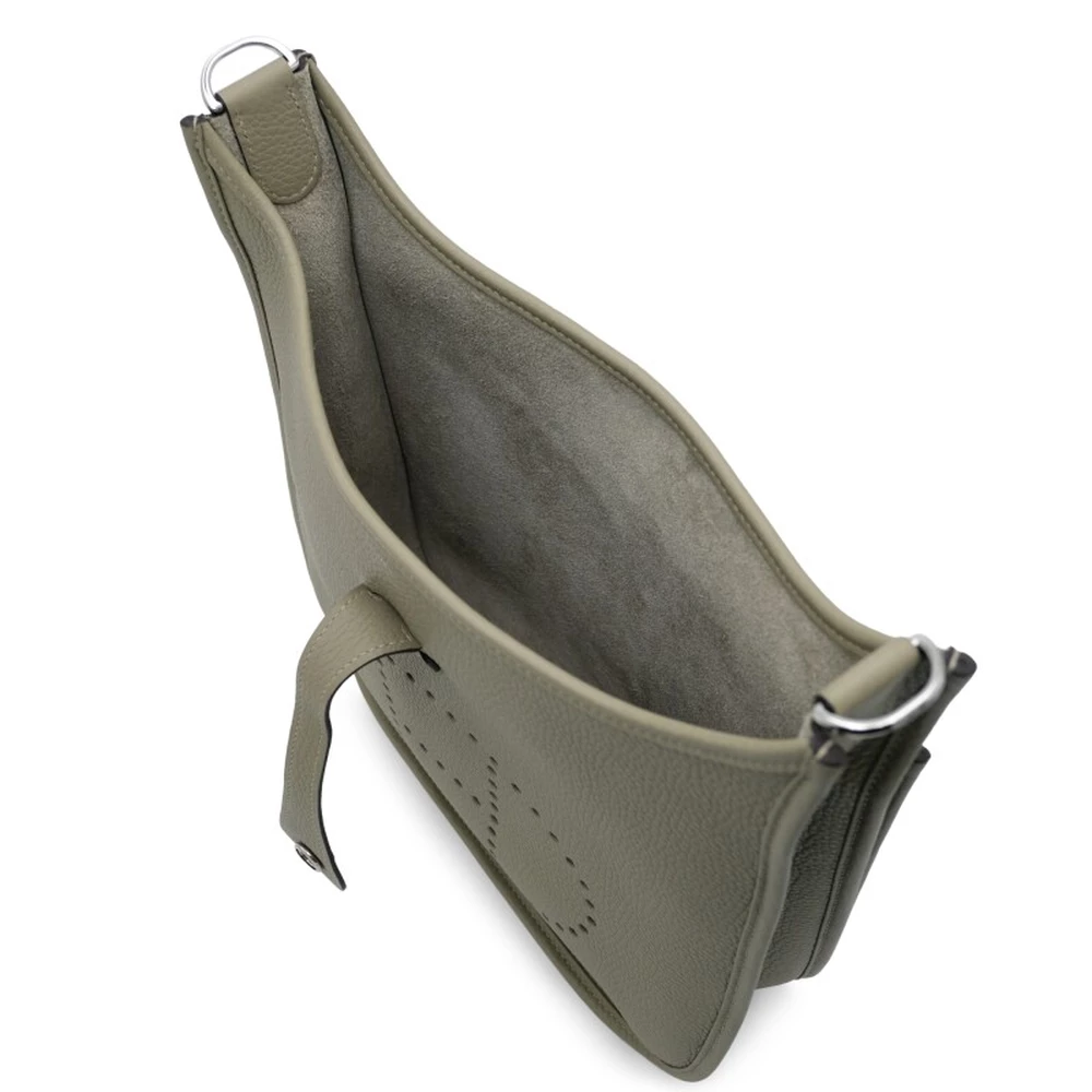 This Hermès Sauge Clémence Evelyne III 29 with Palladium Hardware is a relaxed yet refined shoulder bag in a muted sage green. The soft Clémence leather ensures a supple and elegant silhouette, while the palladium hardware maintains a sleek aesthetic. The perforated “H” logo and spacious interior make it an ideal luxury everyday bag.