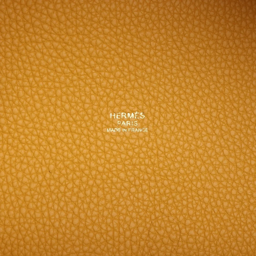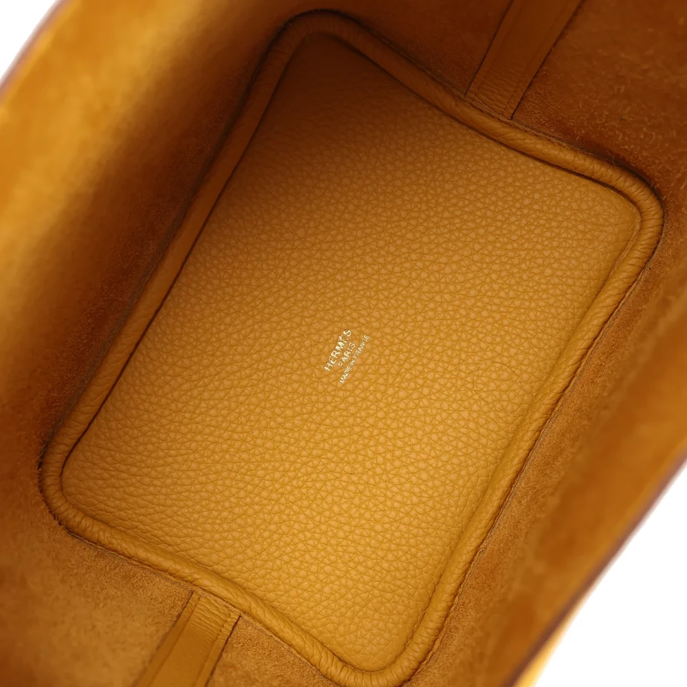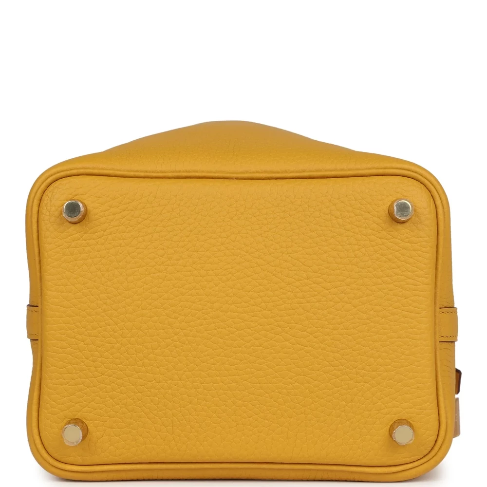 This Hermès Picotin 18 Jaune Ambre Clémence with Gold Hardware is a stunning and warm handbag in a deep amber-yellow shade. The grained Clémence leather adds to its luxurious feel, while the gold hardware enhances its rich, golden tones. The bucket-style design ensures both elegance and practicality. This Picotin is a bold and sophisticated statement piece.