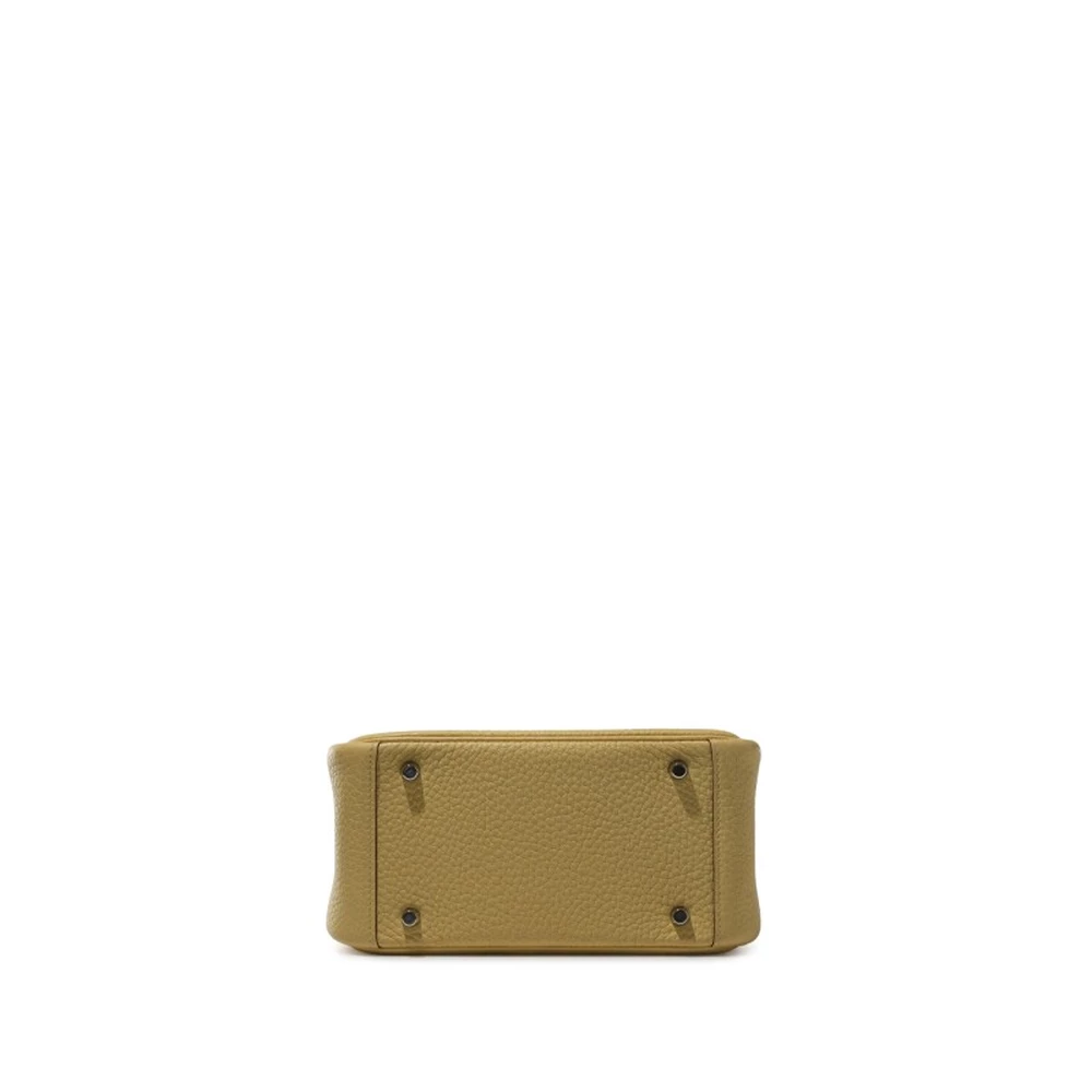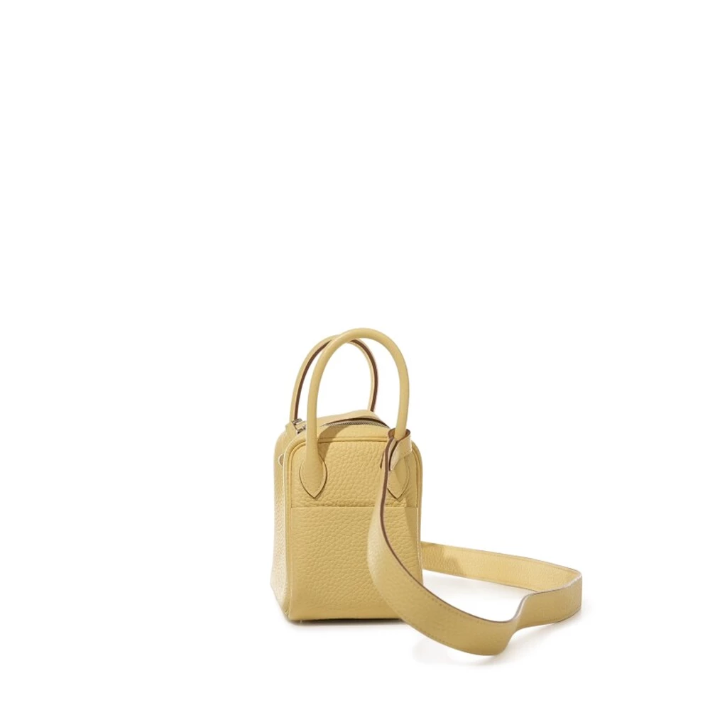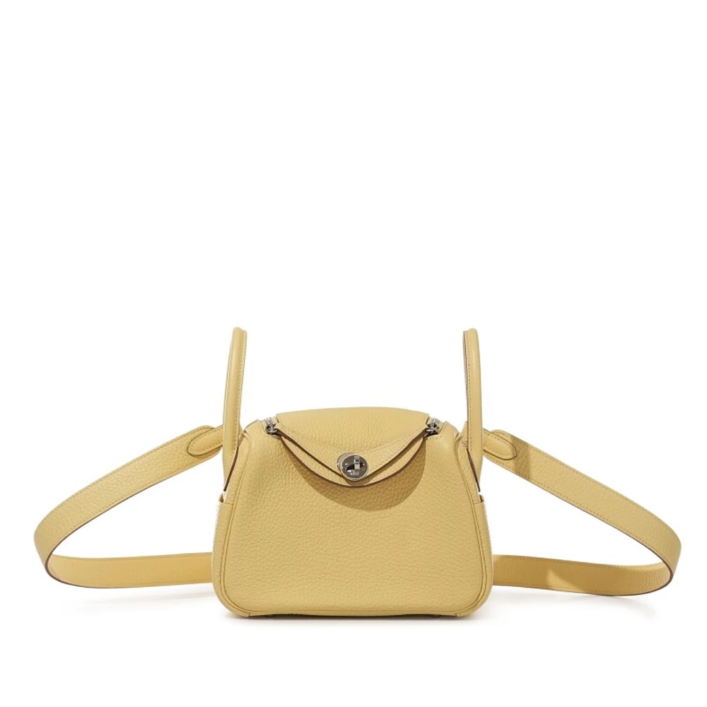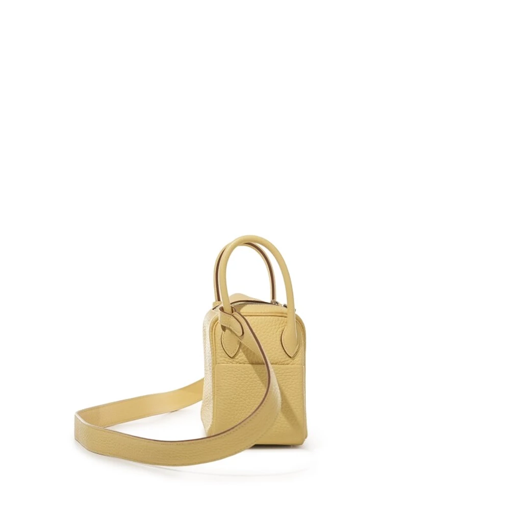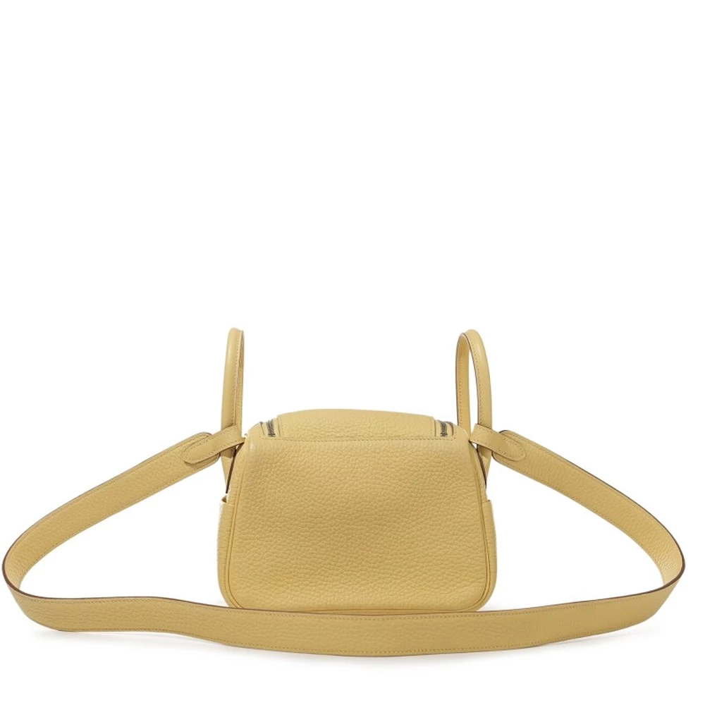 This Hermès Jaune Poussin and Nata Clémence Verso Mini Lindy 20 with Palladium Hardware is a charming handbag in a soft pastel yellow and cream combination. The grained Clémence leather ensures durability, while the palladium hardware adds a modern touch. Its petite size makes it a delicate yet practical accessory.