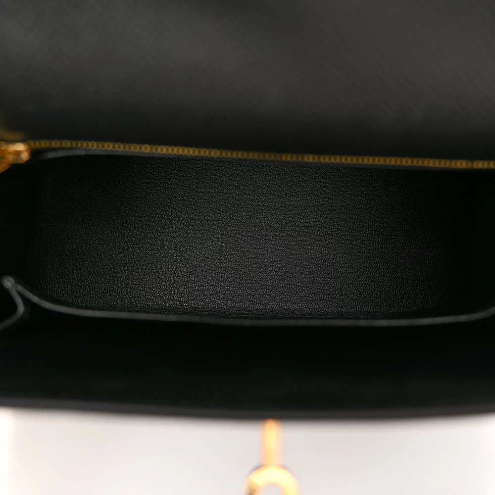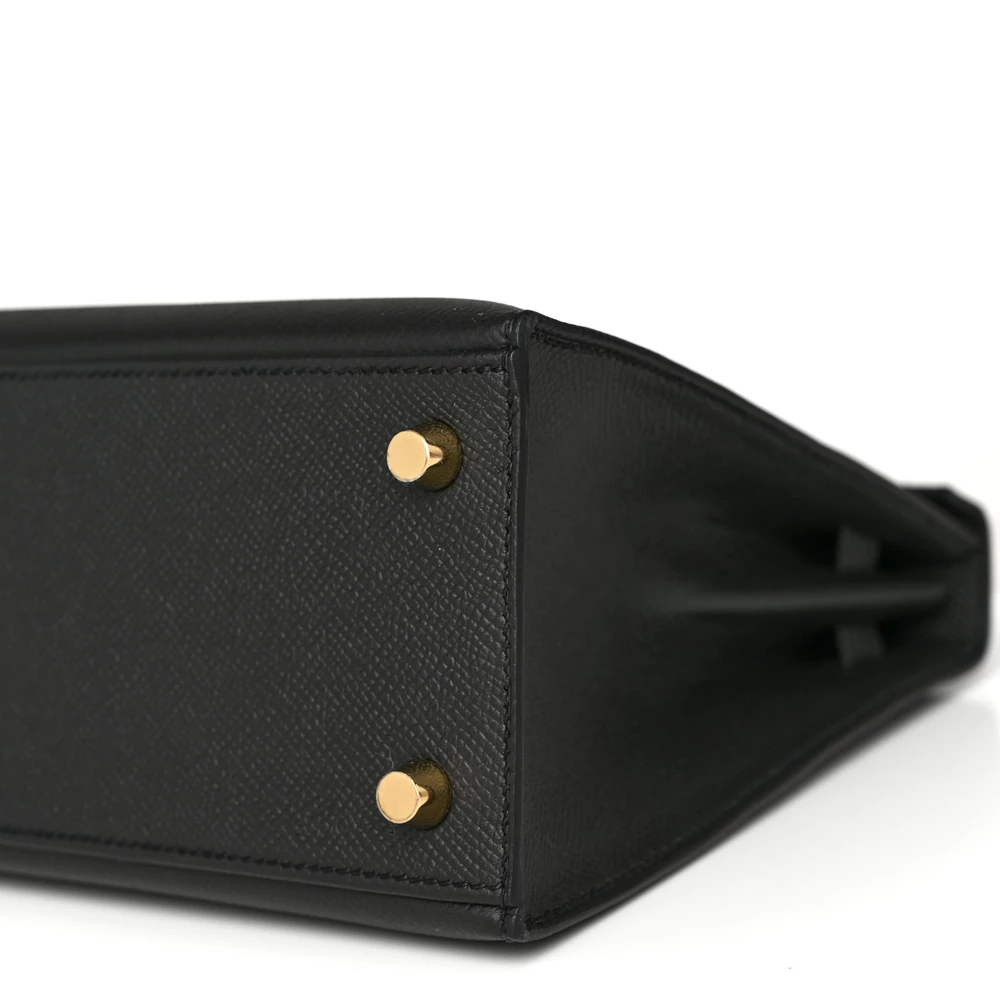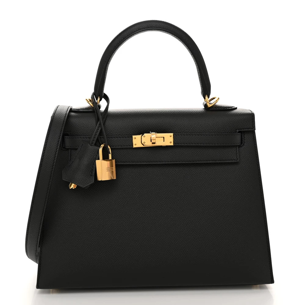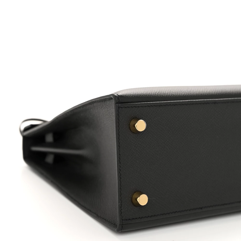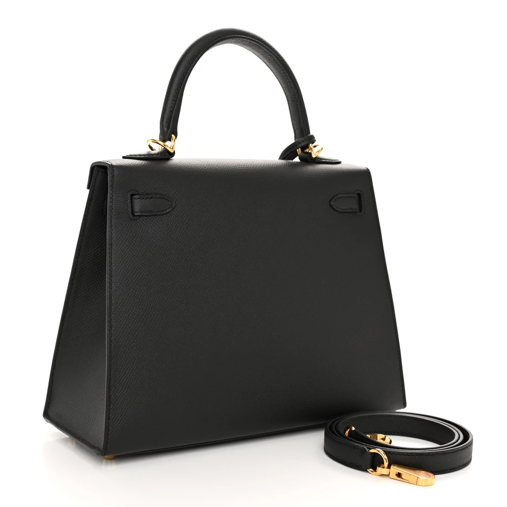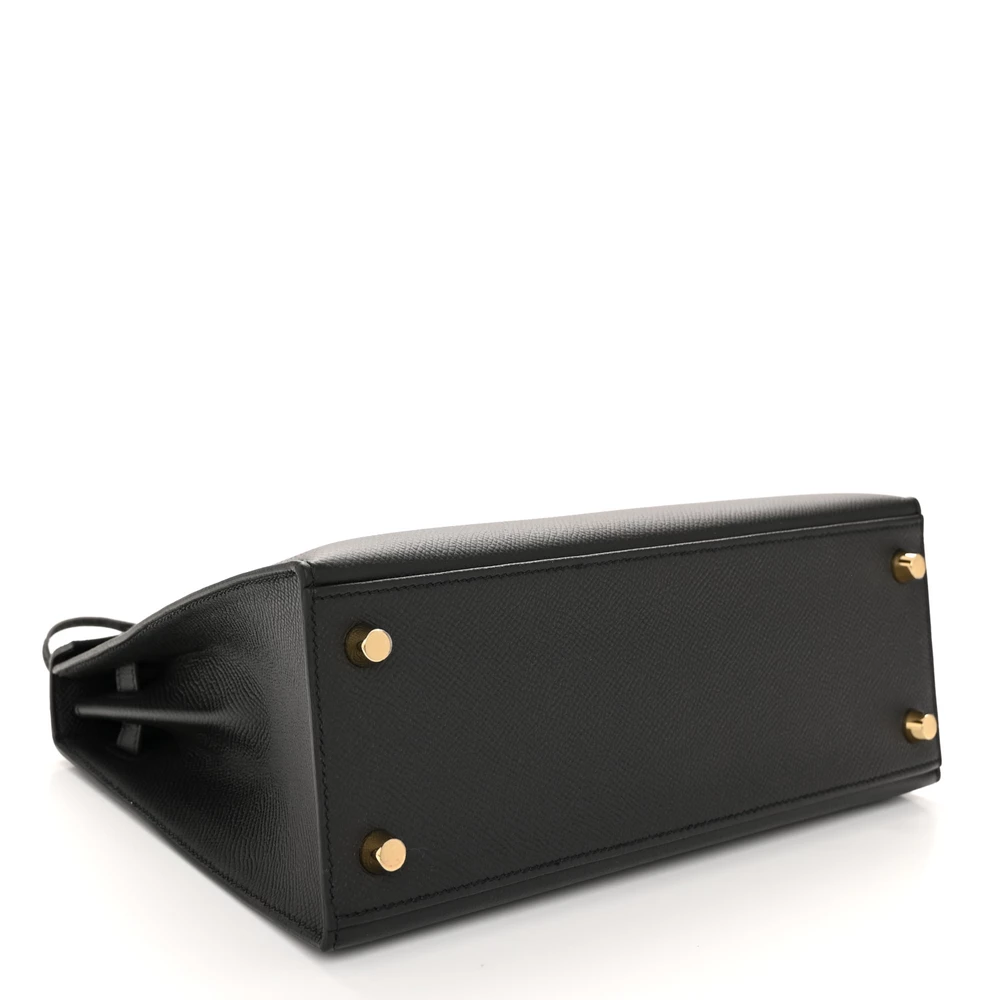 This Hermès Epsom Kelly Sellier 25 Black is a structured and refined handbag in a classic black shade. The Epsom leather provides a polished, scratch-resistant finish, ensuring a crisp silhouette. The Sellier construction enhances its sharp and sophisticated appeal. Gold hardware adds a touch of timeless elegance. This Kelly is a must-have for any luxury collection.