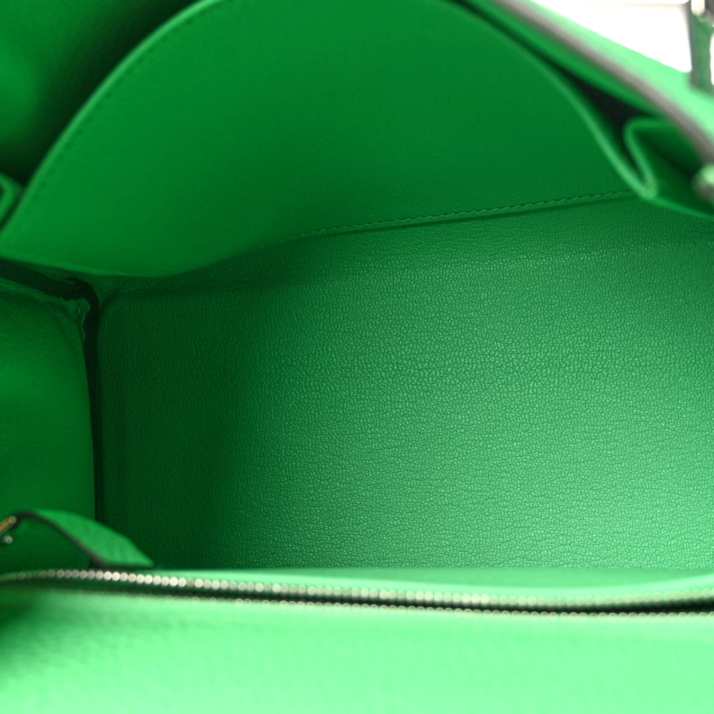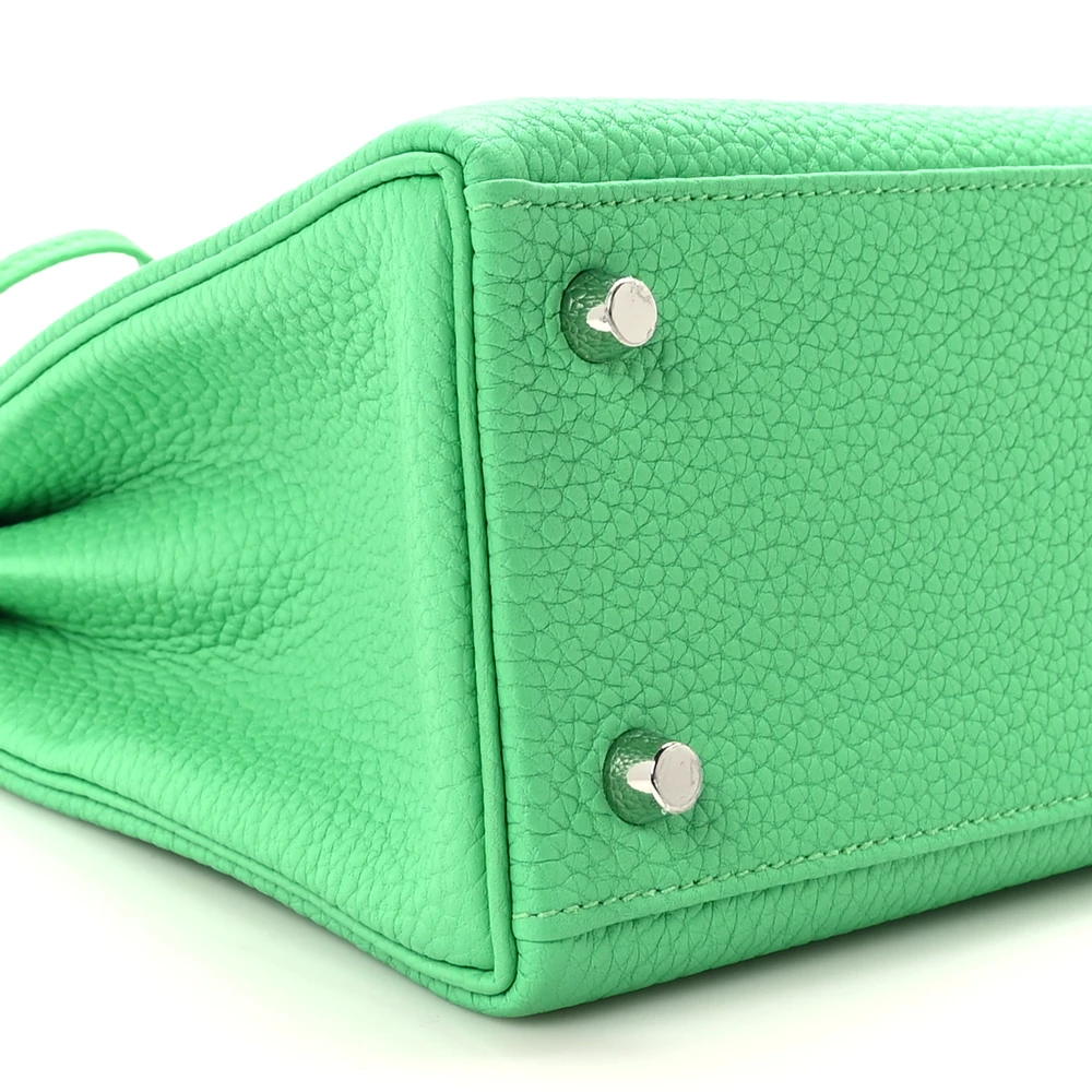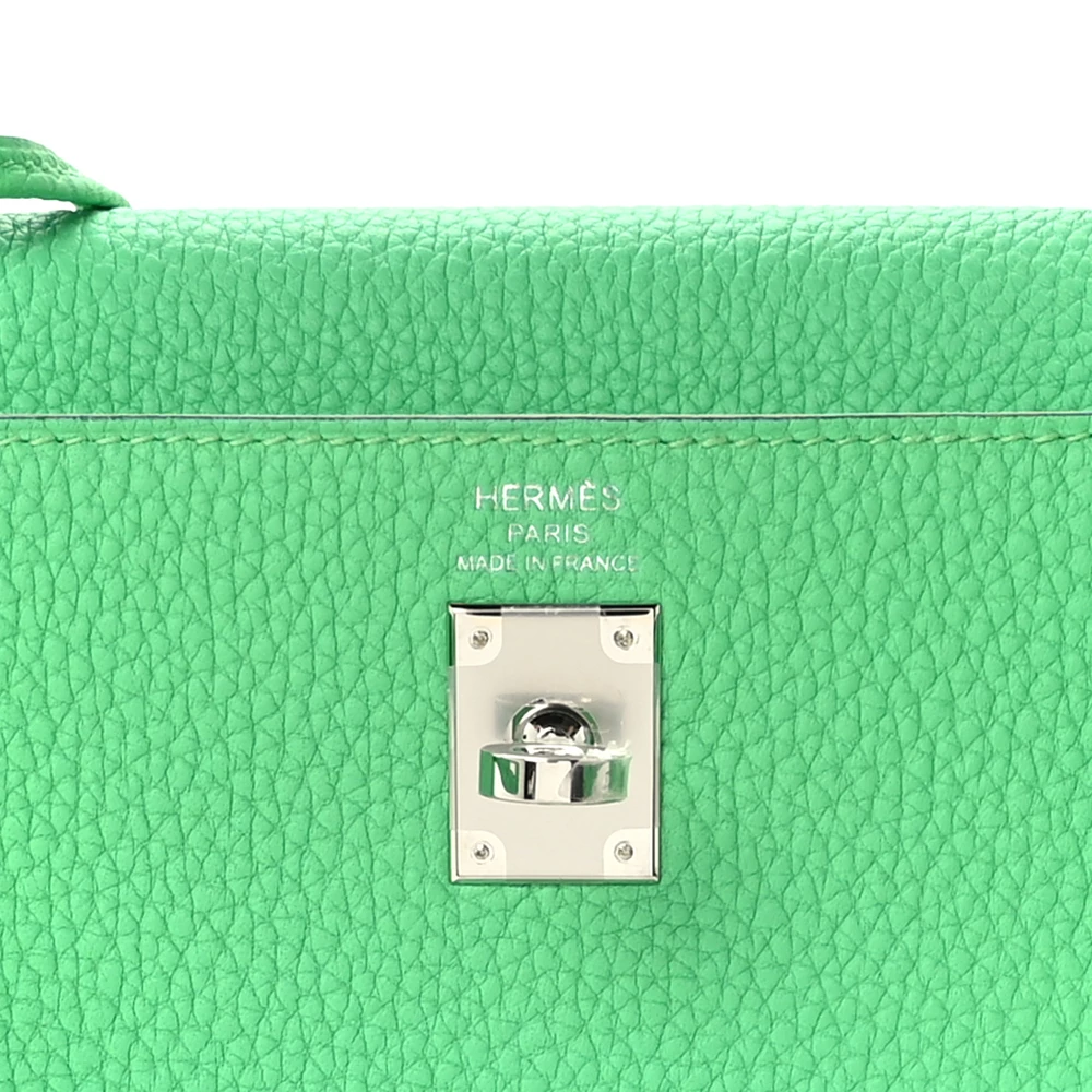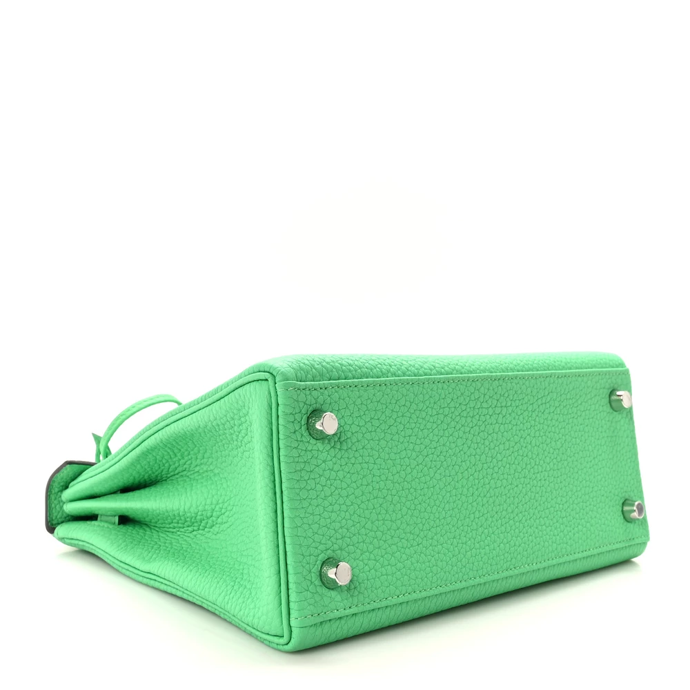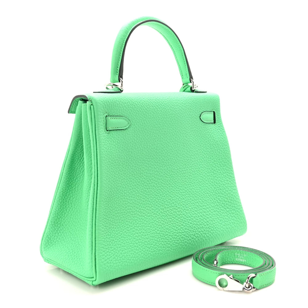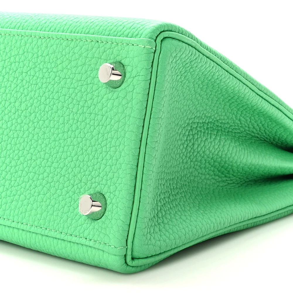 This Hermès Togo Kelly Retourne 25 Vert Comics is a bold and unique handbag in a striking green shade. The Togo leather provides a supple, grained texture, ensuring durability and a relaxed shape. The Retourne construction softens its silhouette, making it perfect for effortless elegance. Palladium hardware adds a sleek, modern contrast. This Kelly is a vibrant and eye-catching statement piece.