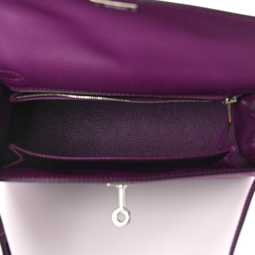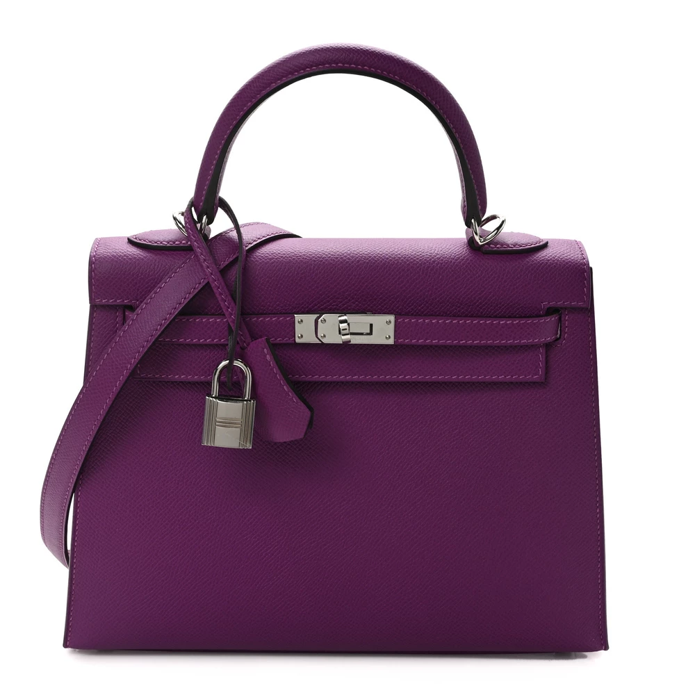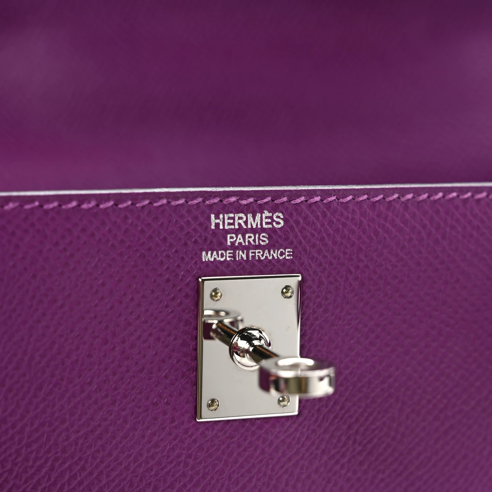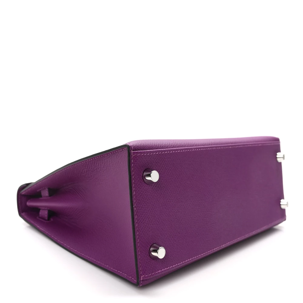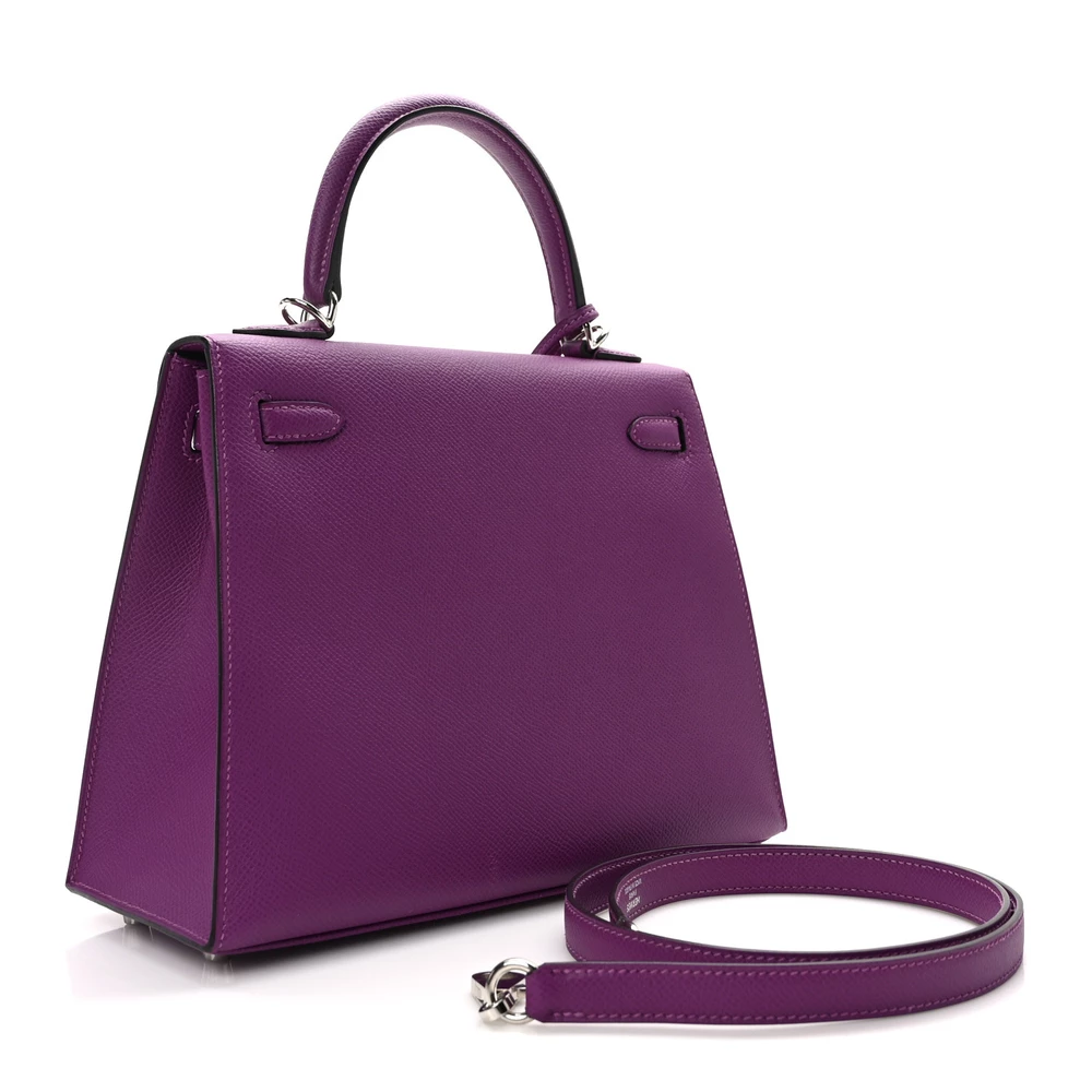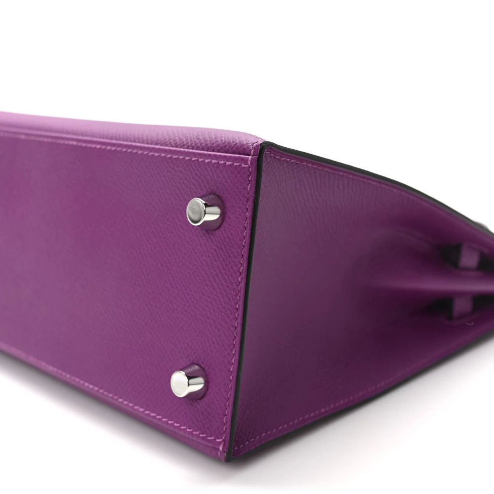 This Hermès Epsom Kelly Sellier 25 Anémone is a refined and structured handbag in a captivating purple shade. The Epsom leather offers a polished, scratch-resistant finish, ensuring a crisp silhouette. The Sellier construction enhances its elegant and sharp lines. Palladium hardware adds a sleek, modern contrast. This Kelly is an exquisite and bold addition to any collection.