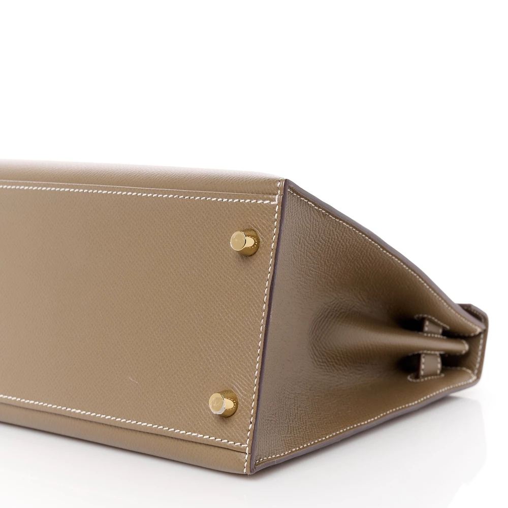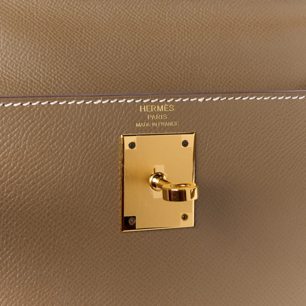 This Hermès Epsom Kelly Sellier 28 Etoupe is a structured and refined handbag in a neutral taupe shade. The Epsom leather provides a scratch-resistant and polished finish, ensuring a sharp silhouette. The Sellier construction enhances its crisp and sophisticated aesthetic. Gold hardware adds a classic and warm touch. This Kelly is a versatile and timeless luxury piece.