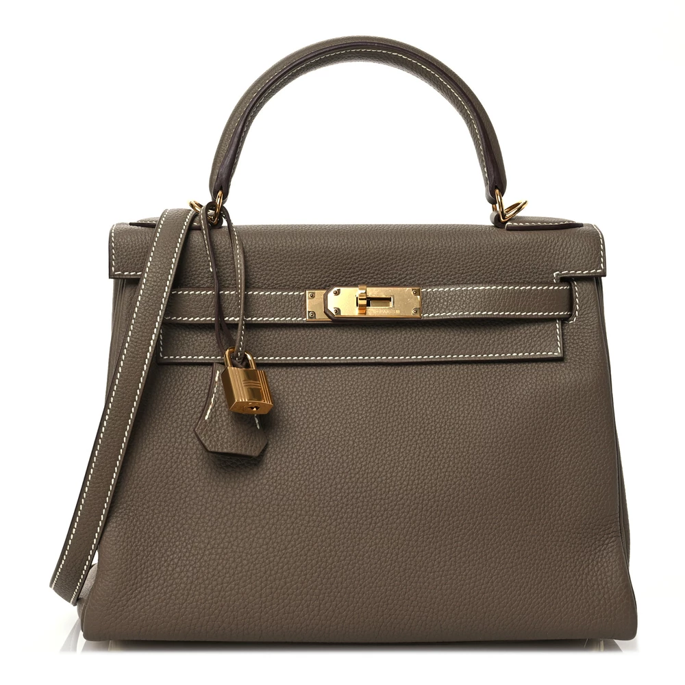 This Hermès Togo Kelly Retourne 28 Etoupe is a timeless and versatile handbag in a neutral taupe shade. The Togo leather provides a soft, grained texture, ensuring durability and a relaxed shape. The Retourne construction enhances its casual yet elegant appeal. Palladium hardware adds a modern touch. This Kelly is an ideal everyday luxury bag.