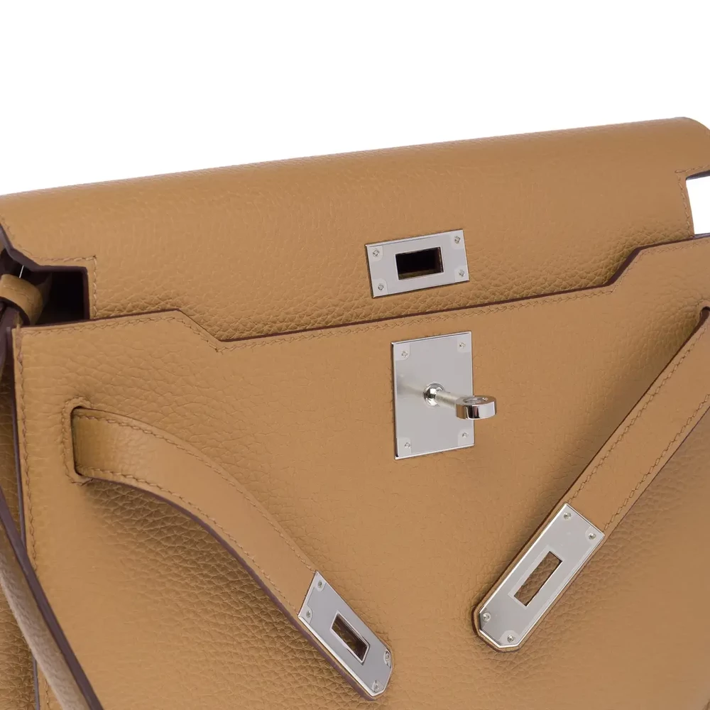 This Hermès Kelly Dépêches 25 Handbag in Biscuit Togo Leather with Palladium Hardware is a refined and structured piece that blends classic craftsmanship with modern practicality. The warm Biscuit hue in supple Togo leather exudes understated elegance, while the palladium hardware adds a sleek, contemporary touch. Designed as a sophisticated business or travel companion, this bag offers both function and style for those who appreciate timeless luxury.