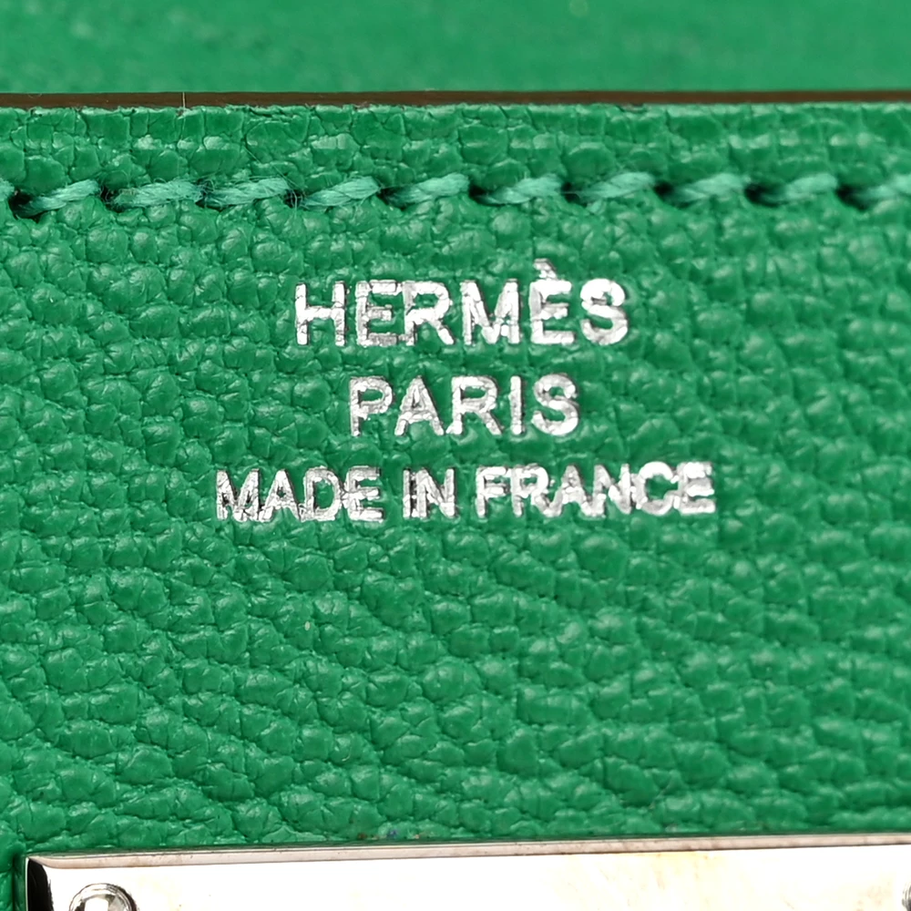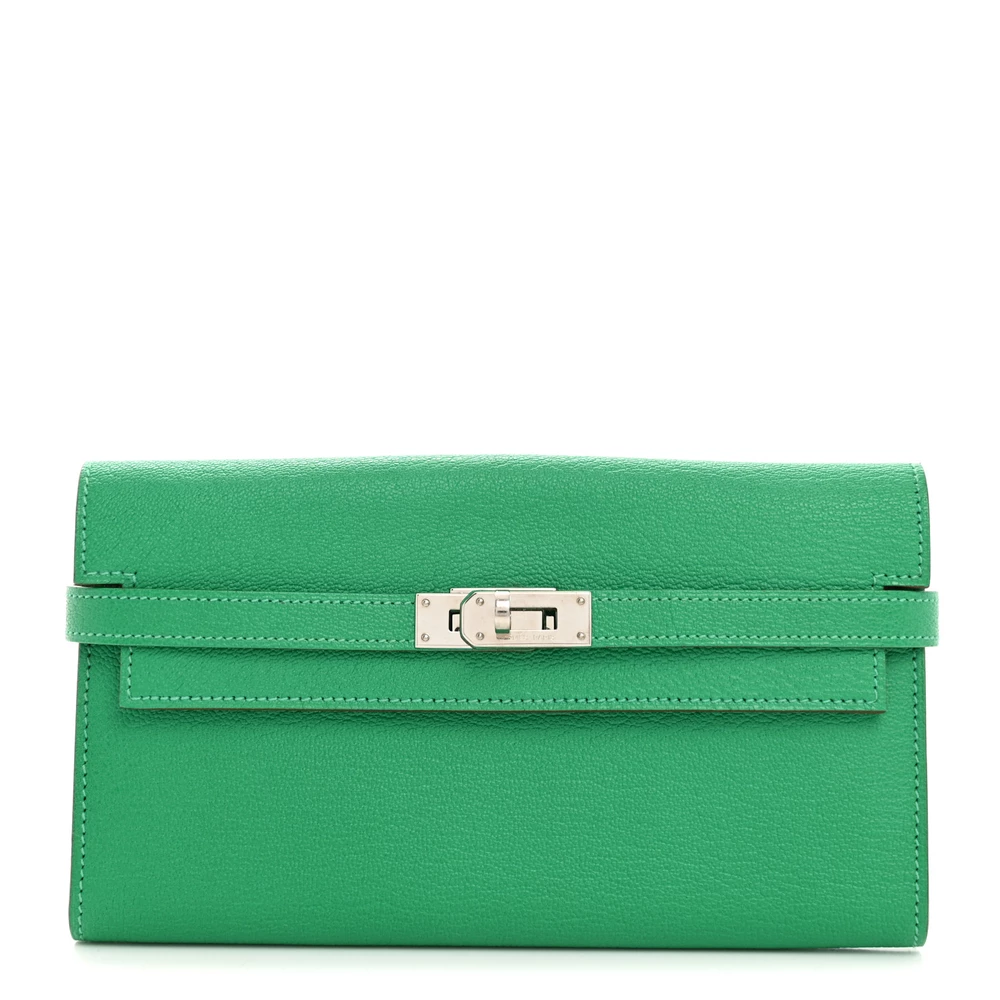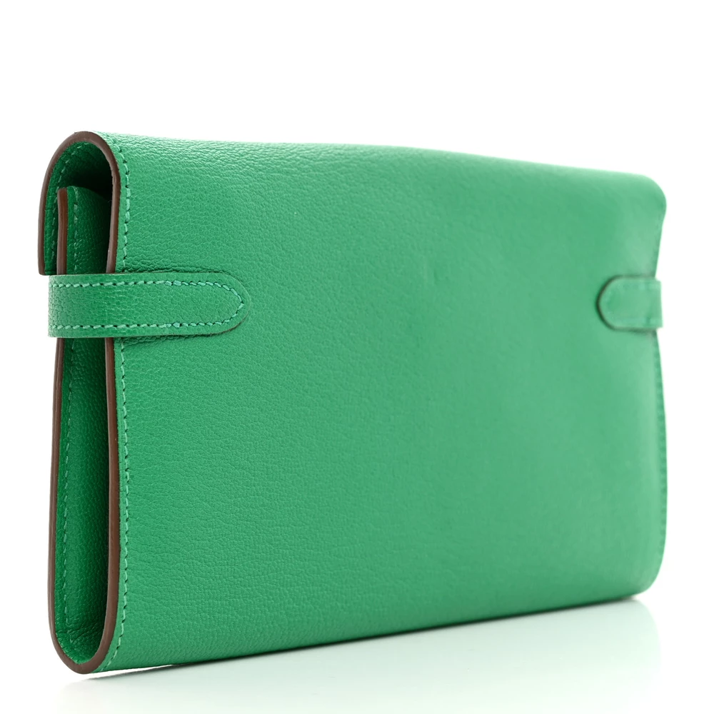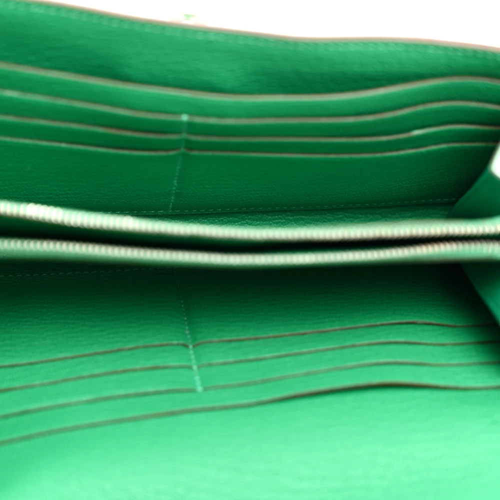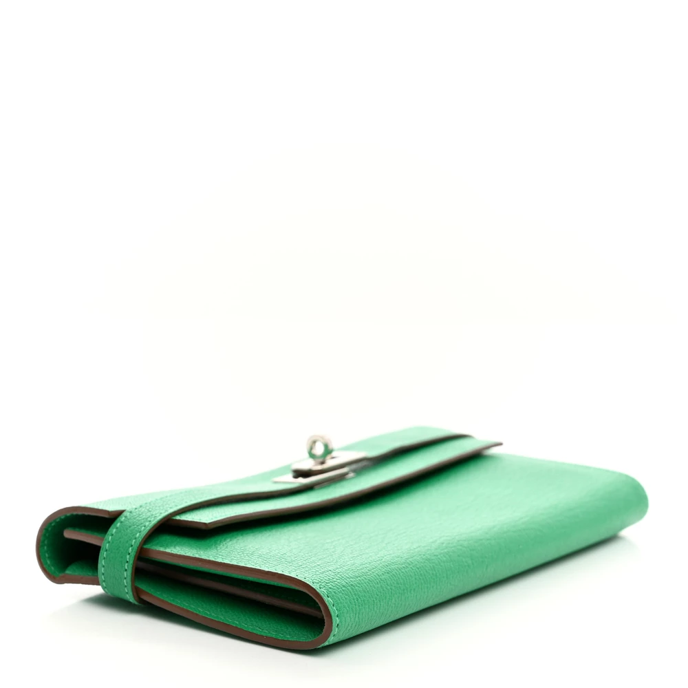 This Hermès Chèvre Mysore Kelly Longue Wallet in Menthe is a refreshing and elegant piece. The vibrant Menthe shade enhances the luxurious grain of Chèvre Mysore leather. Featuring the signature Kelly closure, it offers a sophisticated aesthetic while providing practical storage. Its elongated design adds to its refined appeal. A must-have for those who love classic Hermès craftsmanship.