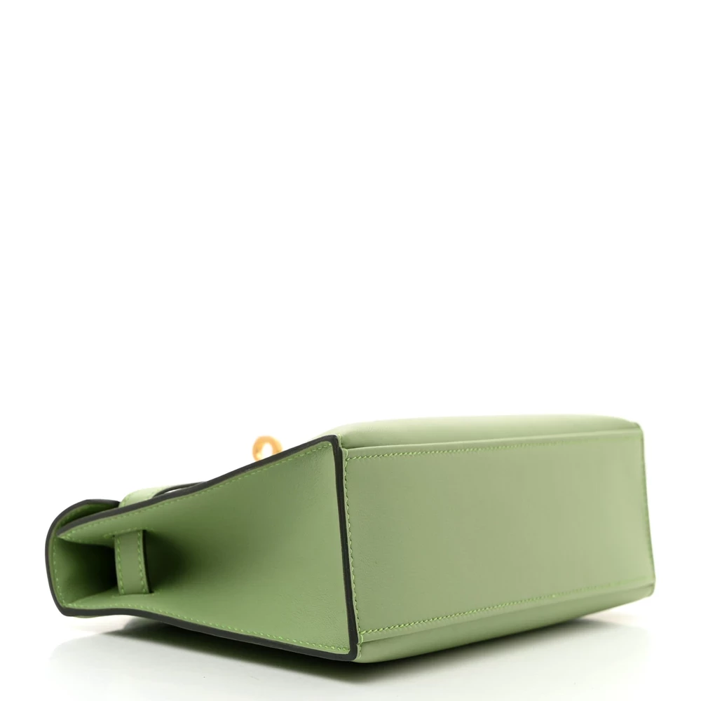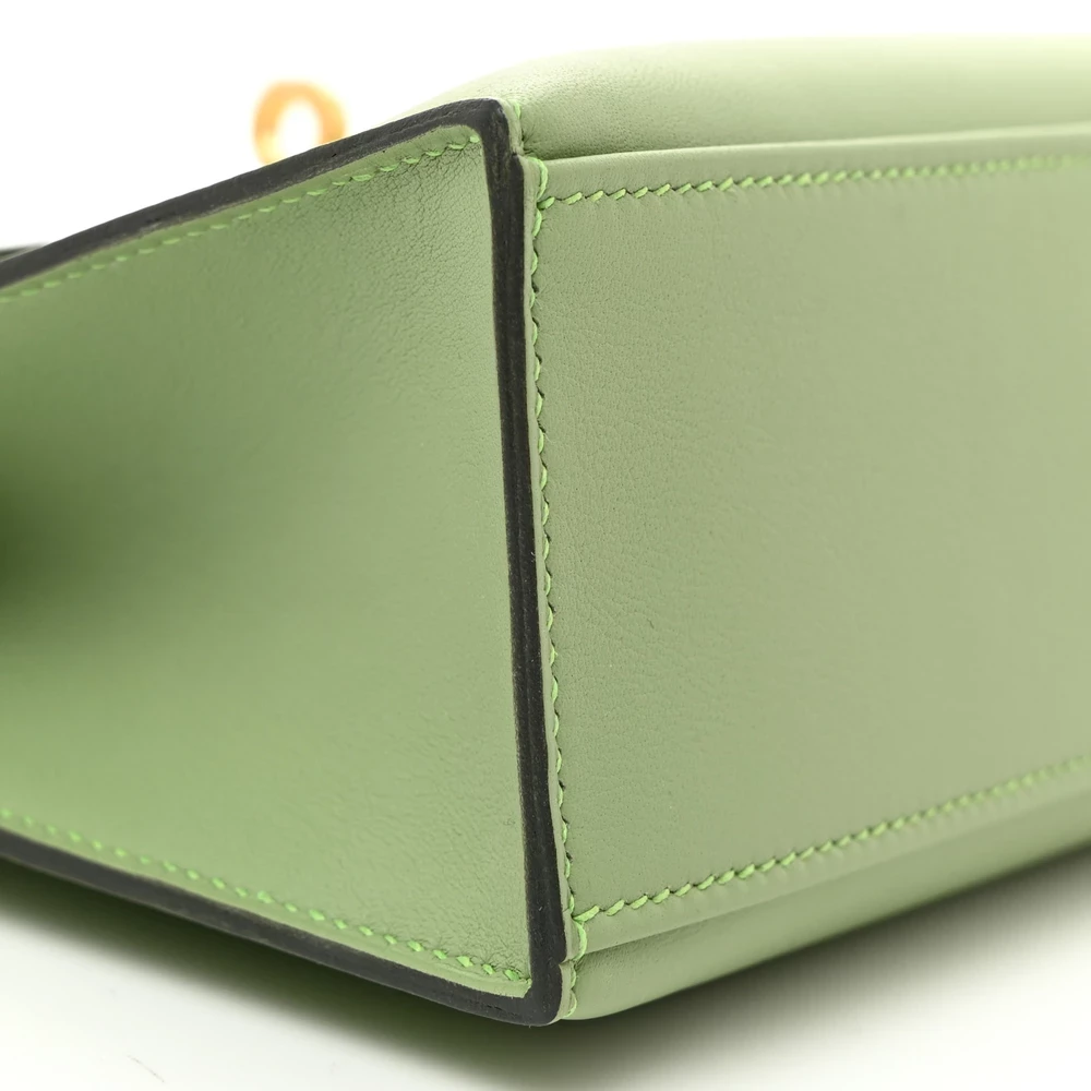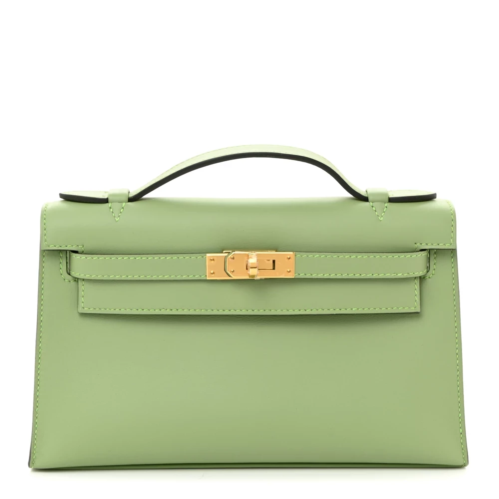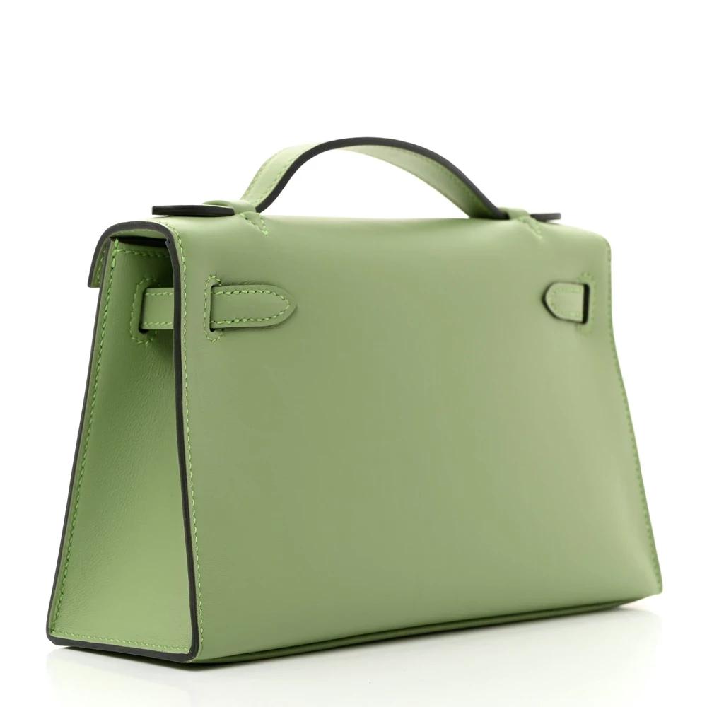 This Hermès Swift Kelly Pochette Clutch Vert Criquet is a fresh and elegant clutch in a stunning pastel green shade. The Swift leather provides a smooth and velvety texture, enhancing its refined appeal. The compact Pochette design makes it ideal for evening wear. Palladium hardware adds a sleek, modern contrast. This clutch is a beautiful and unique statement piece.