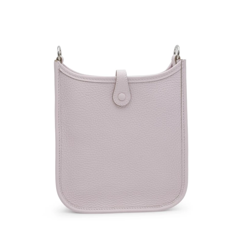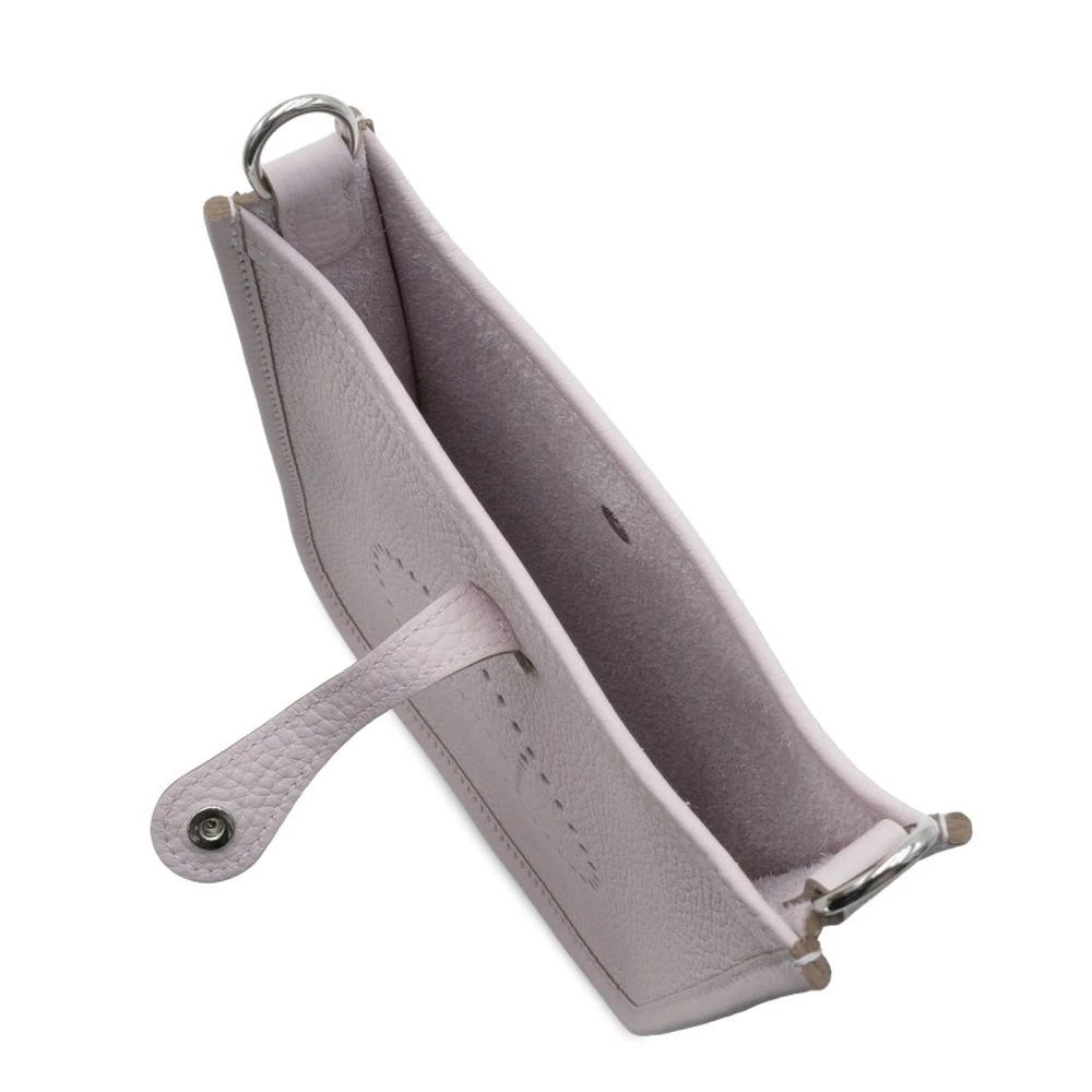 This Hermès Mauve Pâle Clémence Mini Evelyne II TPM 16 with Palladium Hardware is a soft and elegant crossbody bag in a delicate muted lavender shade. The supple Clémence leather enhances its gentle sophistication, while the palladium hardware provides a sleek and contemporary touch. The perforated “H” logo and petite size make it an effortlessly stylish choice.
