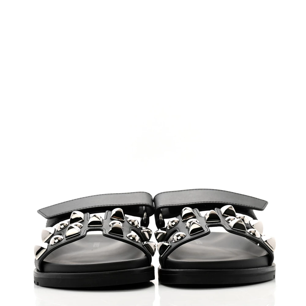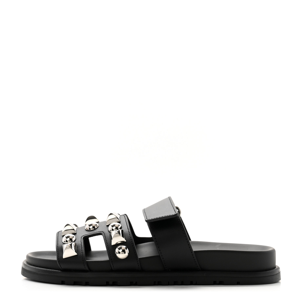 This Hermès Chypre sandal in Black calfskin with Medor studs is a bold and edgy take on a classic design. The signature studded detailing adds a rebellious yet sophisticated touch, while the ergonomic sole ensures all-day comfort. Designed with an adjustable strap for a secure fit, it blends practicality with high-fashion appeal. Whether styled with relaxed casual wear or statement pieces, this sandal stands out effortlessly.