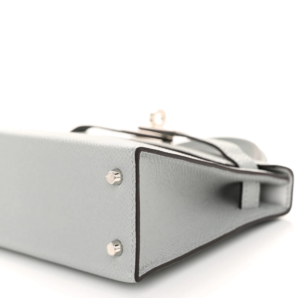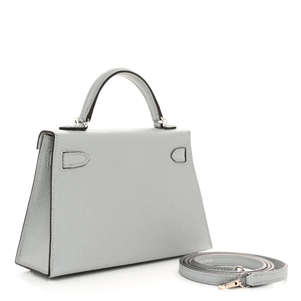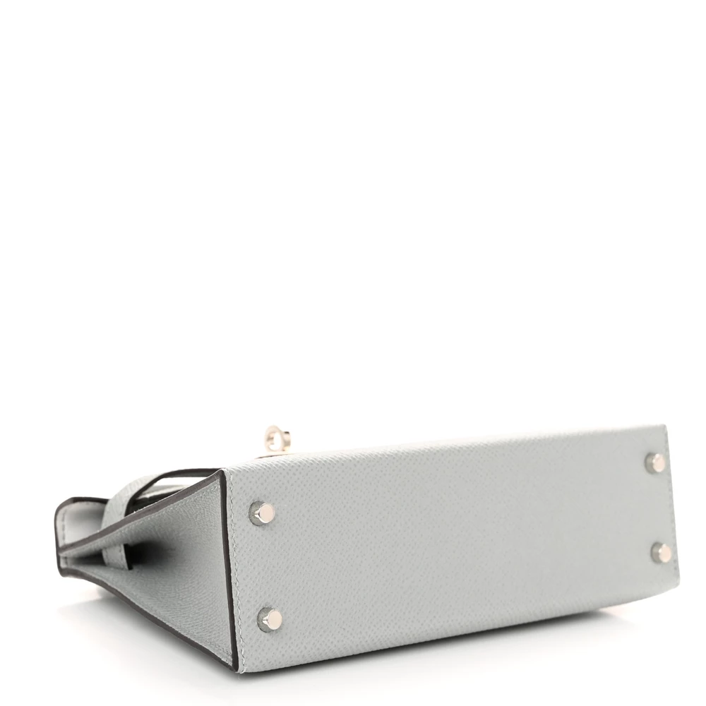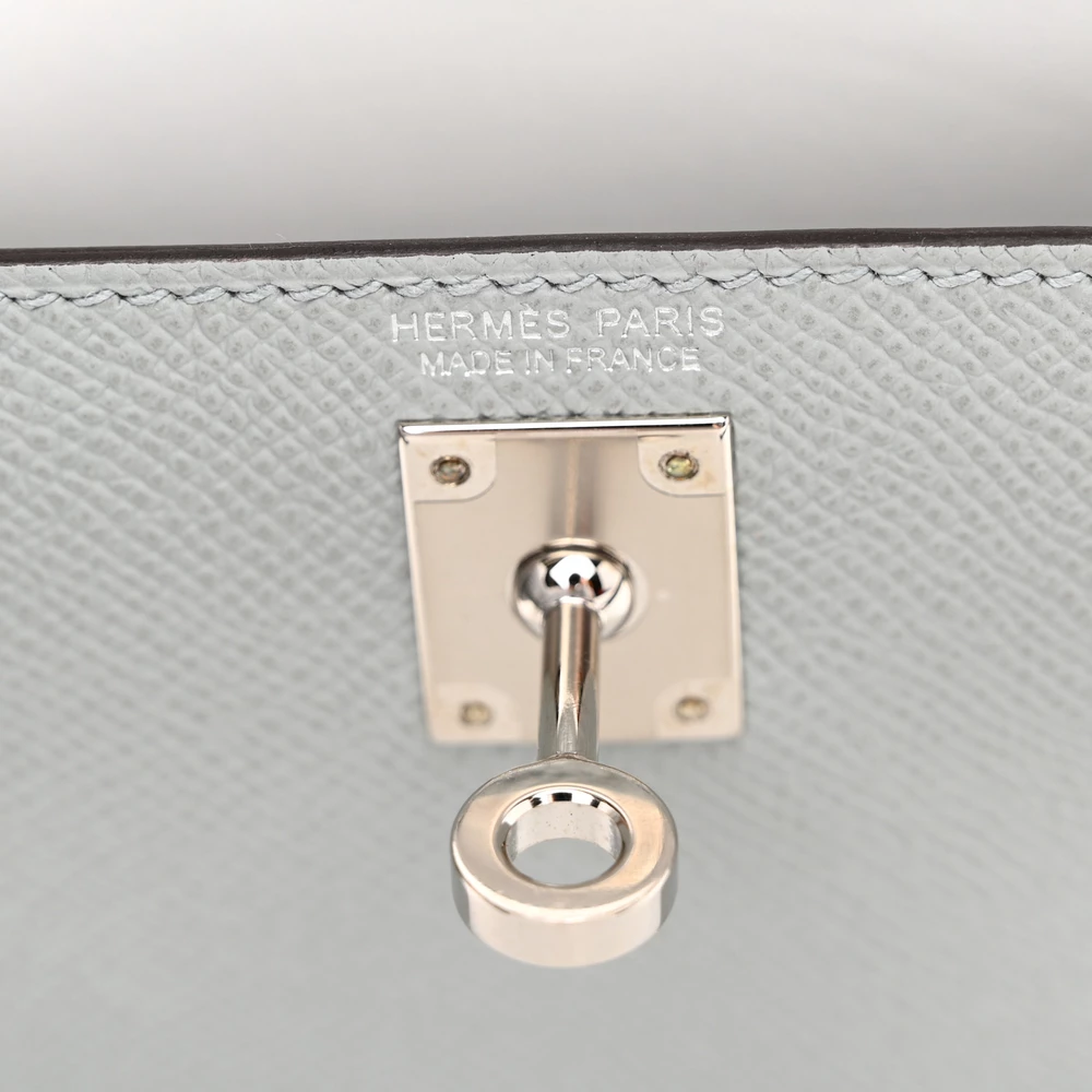 This Hermès Epsom Mini Kelly Sellier 20 Bleu Glacier is a delicate and refined handbag in a soft icy blue shade. The Epsom leather ensures a structured and polished finish, maintaining its crisp silhouette. The compact Mini Kelly size makes it an elegant and highly sought-after piece. Palladium hardware provides a sleek contrast. This Kelly is a chic and sophisticated choice for any collection.