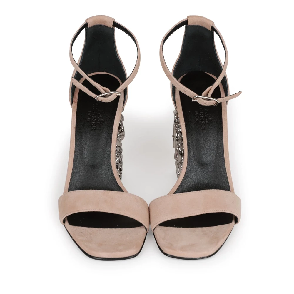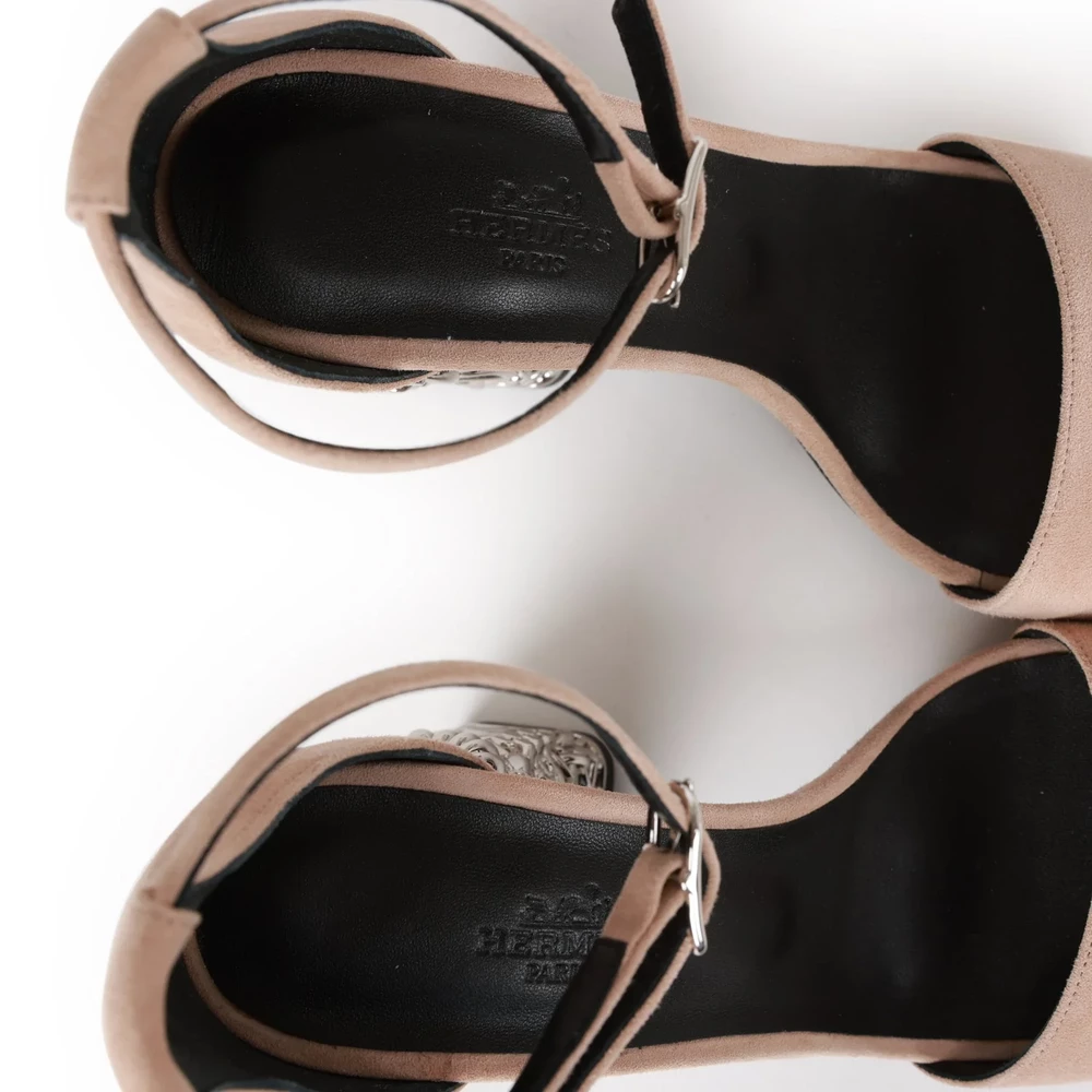 This Hermès Glam 105 Sandal in beige suede is a refined and feminine choice. The high heel silhouette elongates the leg, creating a graceful and sophisticated look. The soft suede material adds a touch of luxury while maintaining comfort. The neutral beige shade allows it to complement various outfits with ease. This sandal is an excellent choice for elegant occasions and polished everyday wear.