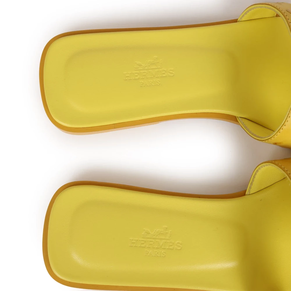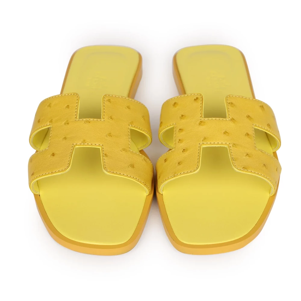 This Hermès Oran Sandal in Jaune Curcuma ostrich leather is a luxurious and unique take on a classic design. The exotic ostrich leather enhances its texture and visual appeal. The warm yellow tone adds vibrancy while remaining elegant. The signature “H” cutout design maintains its timeless identity. This sandal is a rare and stylish choice for those who appreciate fine craftsmanship and distinctive materials.