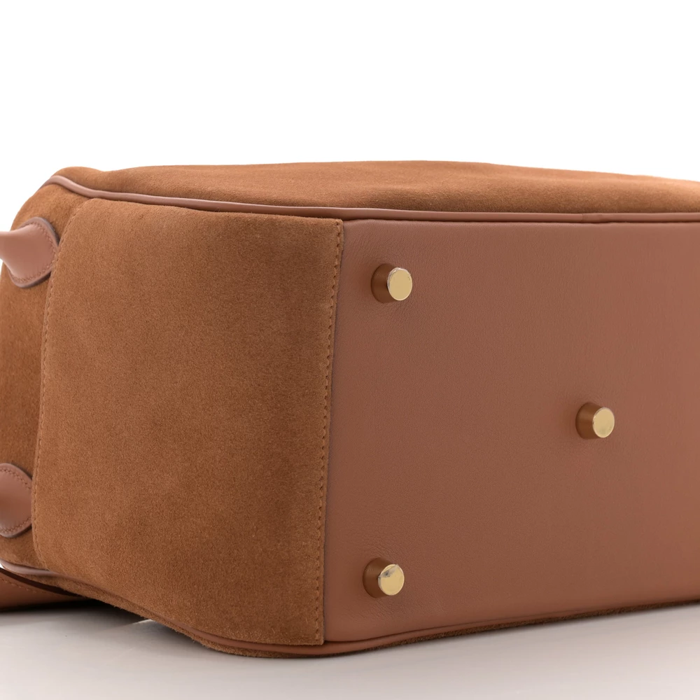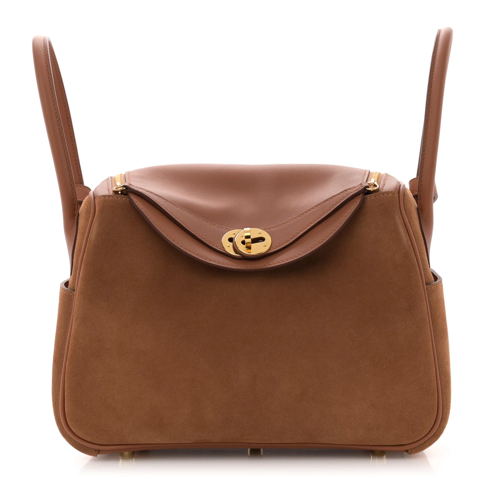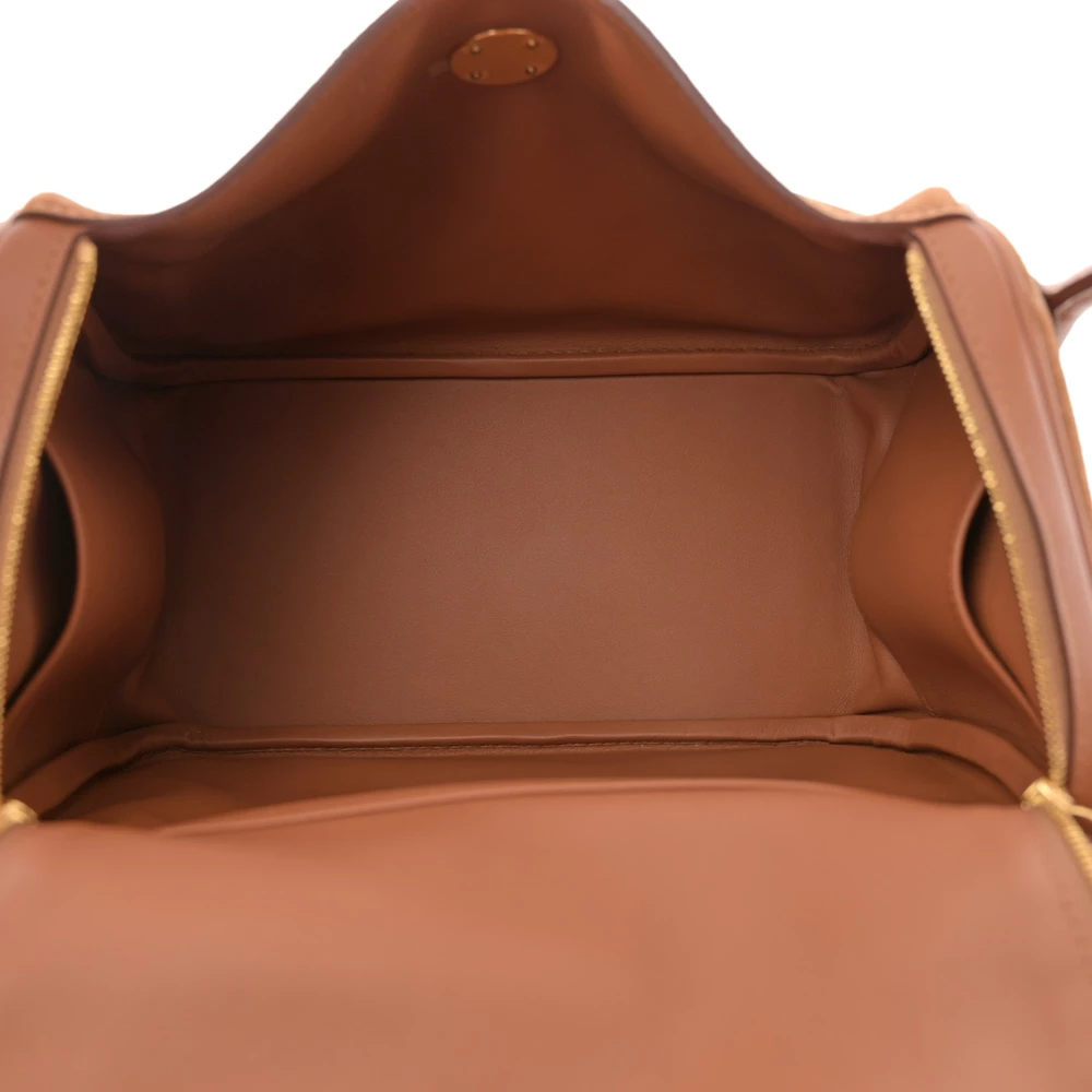 This Hermès Swift Grizzly Lindy 26 in Gold is a rare and luxurious handbag featuring a mix of Swift and Grizzly leather. The combination of smooth and suede-like textures creates depth and richness, making it a standout piece. Its structured shape is softened by the slouchy leather, making it both refined and relaxed. The gold hardware enhances its timeless appeal, adding to its versatility.