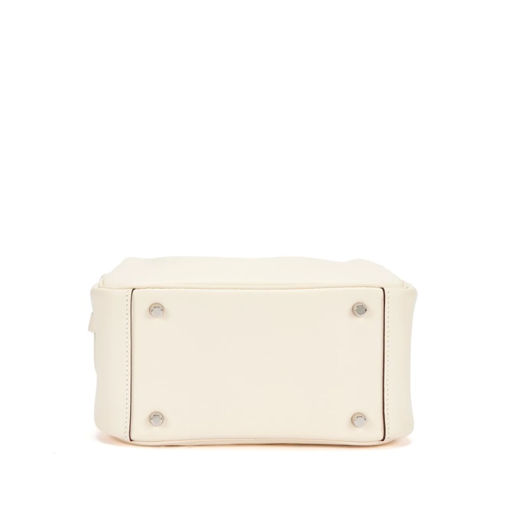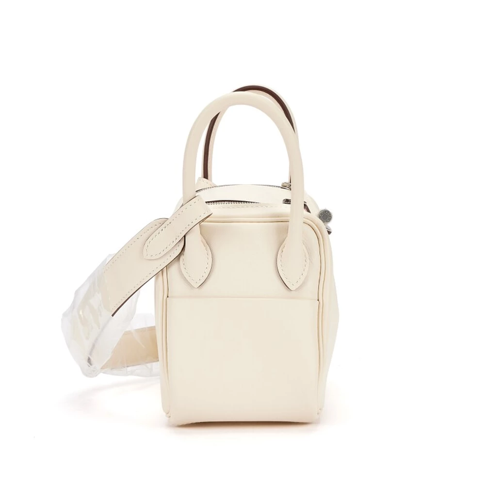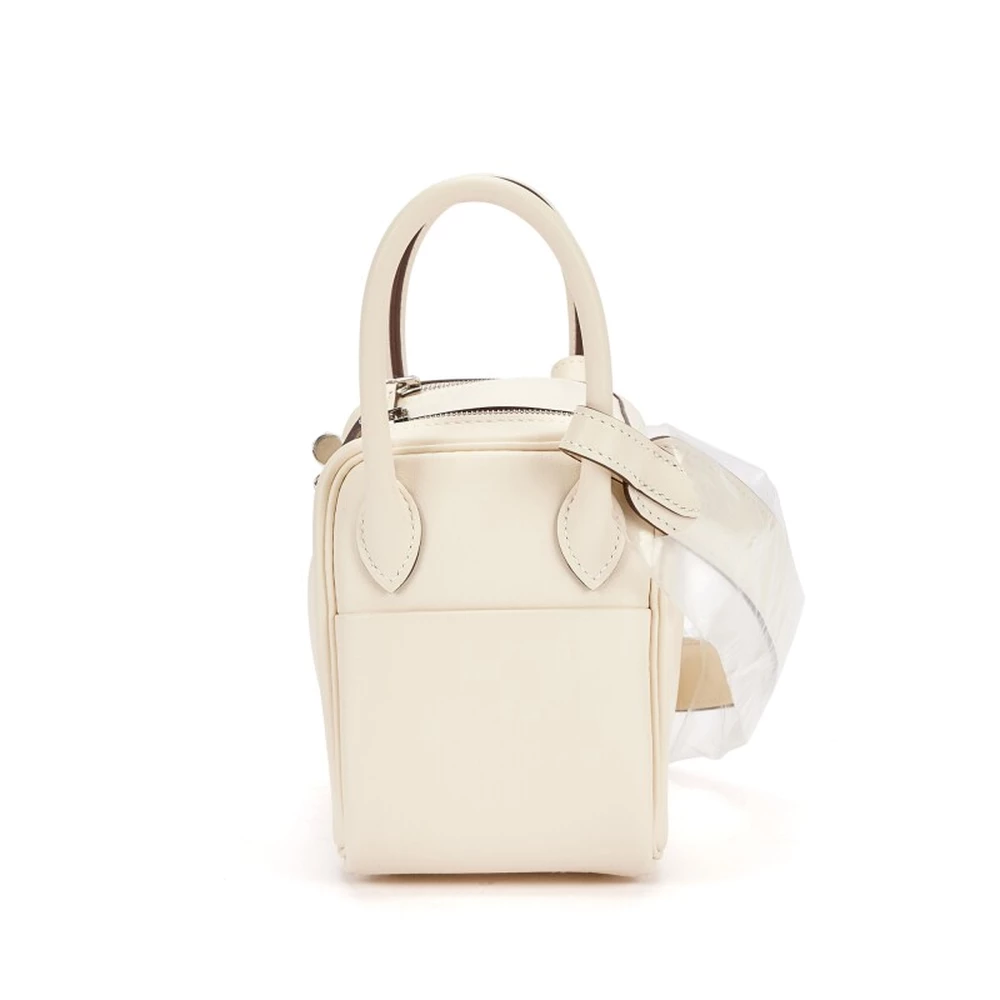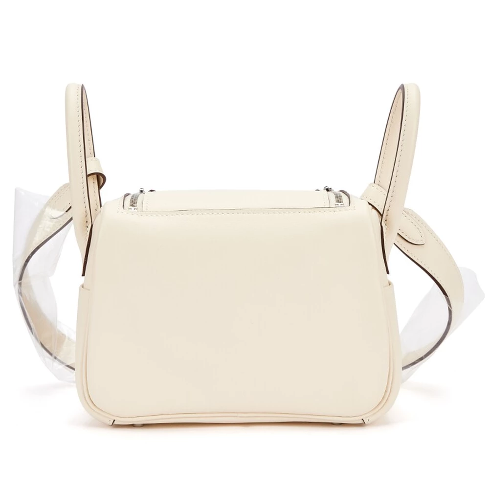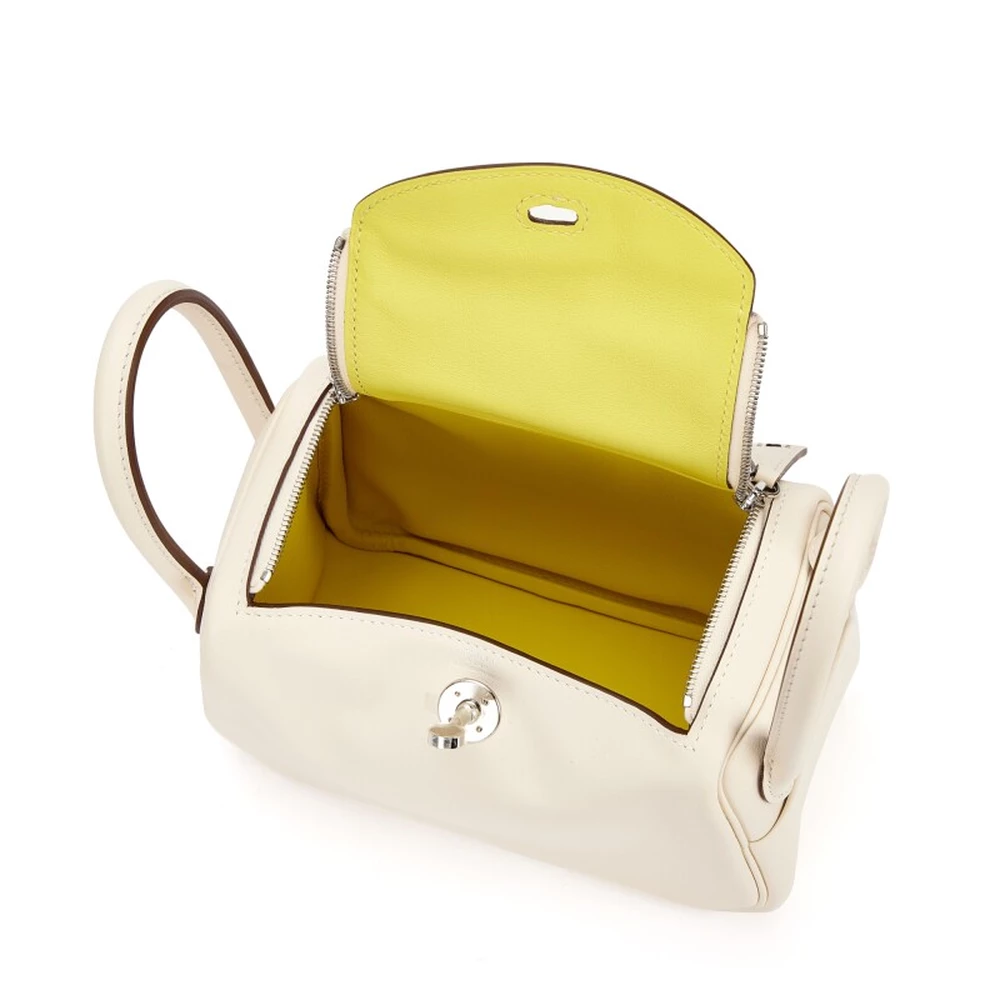 This Hermès Nata and Lime Swift Verso Mini Lindy 20 with Palladium Hardware is a striking handbag featuring a unique cream and lime green colorway. The Swift leather gives it a smooth and modern feel, while the palladium hardware keeps the design fresh. Its petite yet functional design makes it a bold and stylish statement piece.