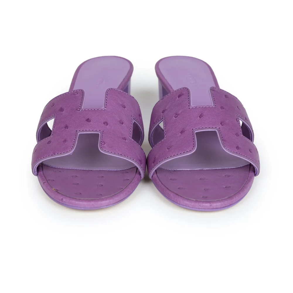 This Hermès Oasis sandal in Violet Parme ostrich is a refined and luxurious choice for any wardrobe. The rich violet hue is enhanced by the unique texture of ostrich leather, offering both elegance and exclusivity. The signature block heel provides a subtle lift while maintaining comfort. The iconic H-cut upper adds a recognizable Hermès touch, making this sandal a sophisticated option for both casual and dressy occasions.