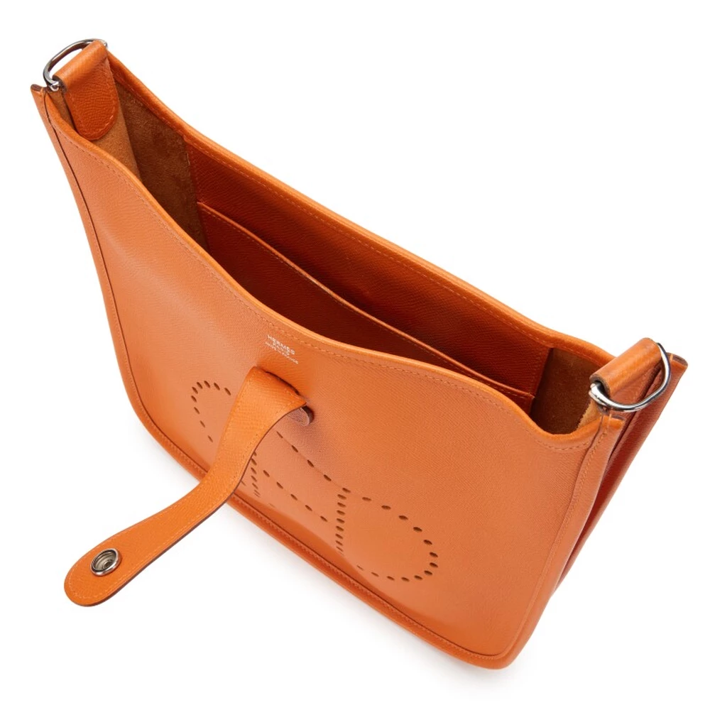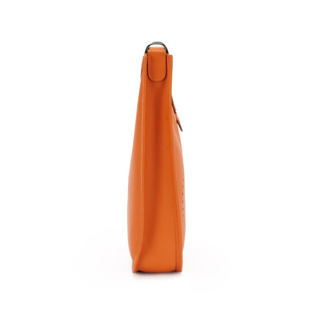 This Hermès Orange Epsom Evelyne II GM with Palladium Hardware is a bold and spacious shoulder bag in Hermès’ signature orange. The Epsom leather provides a structured and durable finish, while the palladium hardware keeps the look modern. The perforated “H” logo and generous size make it a standout luxury essential.