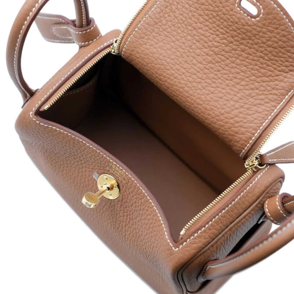 This Hermès Gold Clémence Mini Lindy 20 with Gold Hardware is a timeless and sophisticated handbag in Hermès’ signature warm caramel shade. The Clémence leather enhances its luxurious softness, while the gold hardware adds a harmonious, polished accent. Small yet versatile, it’s a refined everyday piece.