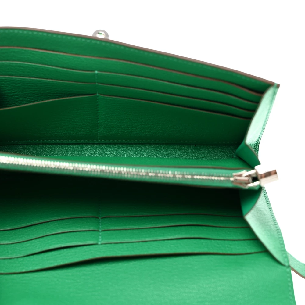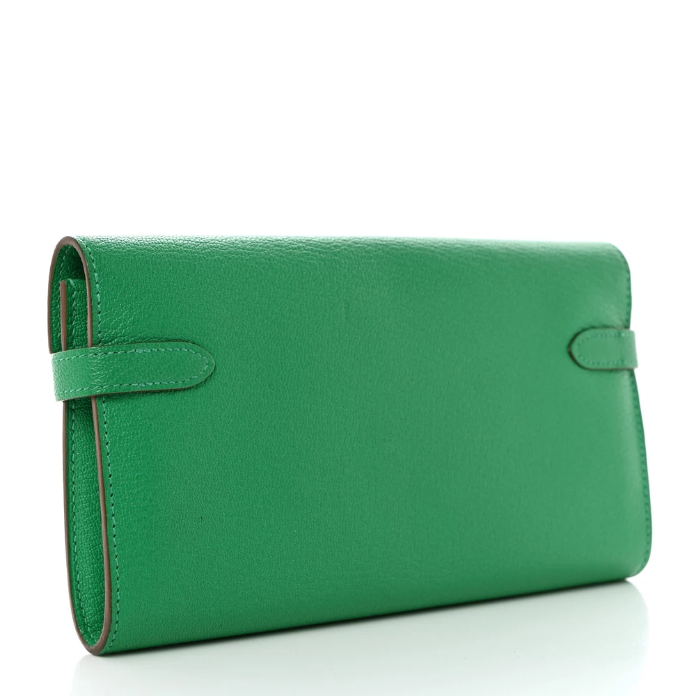 This Hermès Chèvre Mysore Kelly Longue Wallet in Bambou is a refreshing and vibrant addition to any collection. The bold green hue complements the fine-grain Chèvre Mysore leather, offering a soft yet durable texture. Featuring the iconic Kelly lock closure, it exudes timeless elegance while providing secure storage. A sophisticated statement piece for those who appreciate standout accessories.