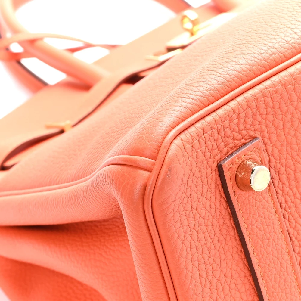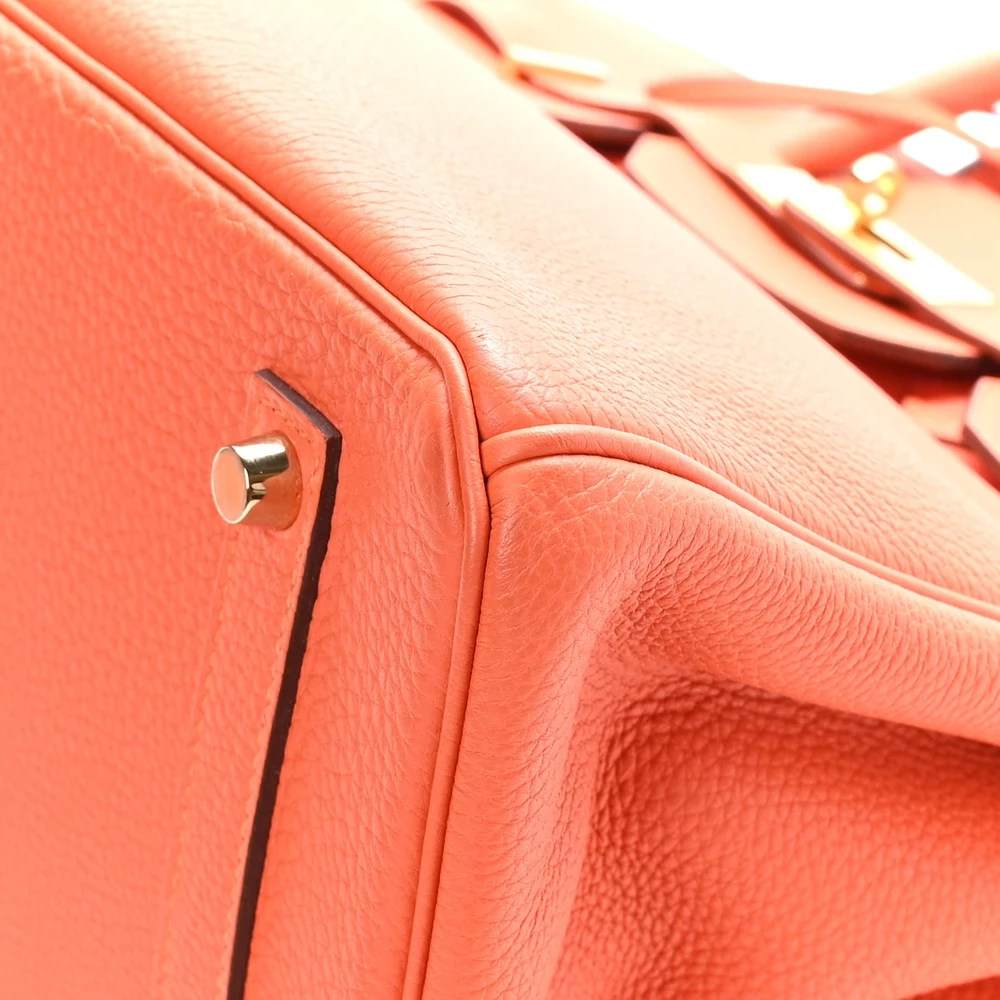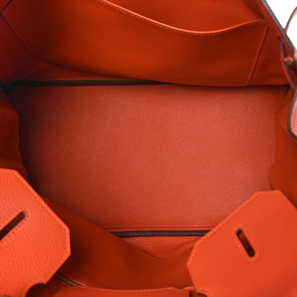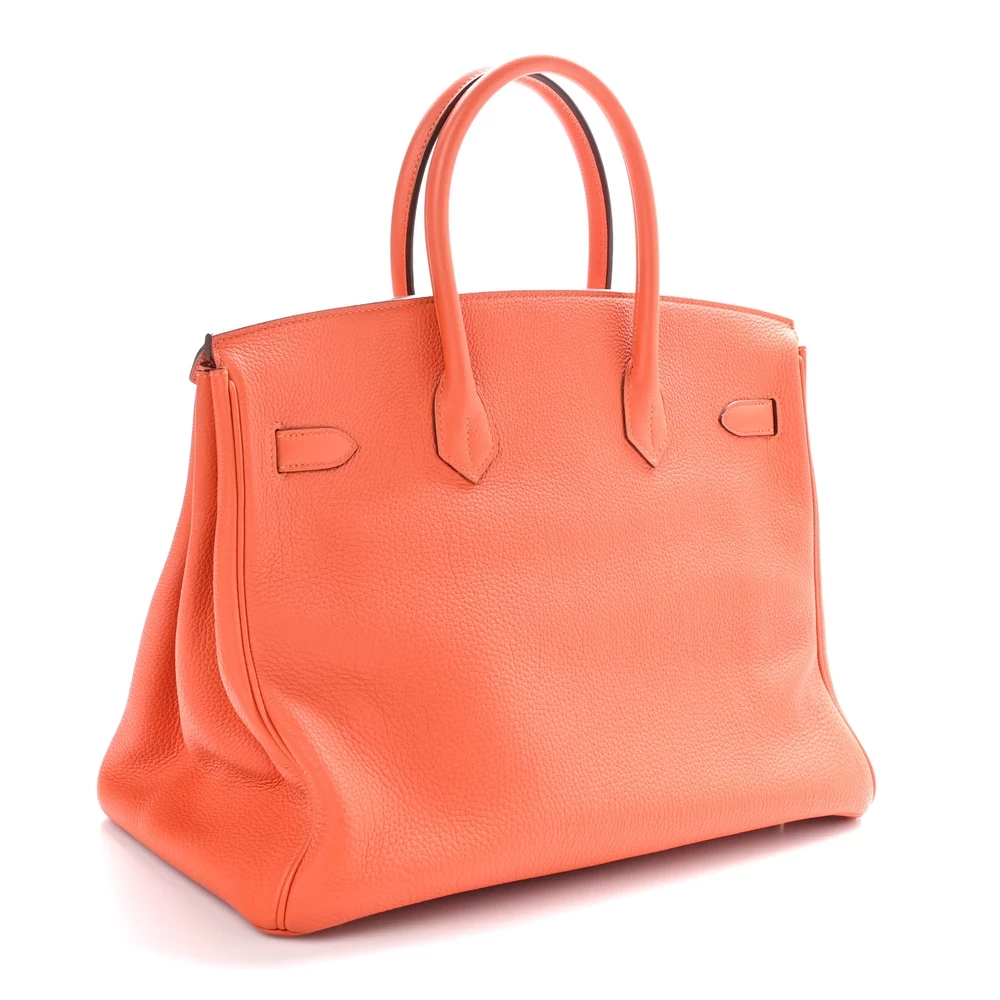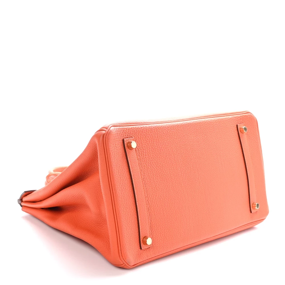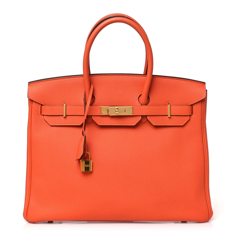 This Hermès Togo Birkin 35 in Feu is a fiery and dynamic handbag in a warm orange-red shade. The Togo leather provides a lightly grained texture and a structured feel, ensuring lasting elegance. Measuring 35 cm, this bag is perfect for those who need ample space without sacrificing style. Gold hardware complements the rich color, adding an extra level of sophistication. This is a bold statement piece that embodies confidence and luxury.