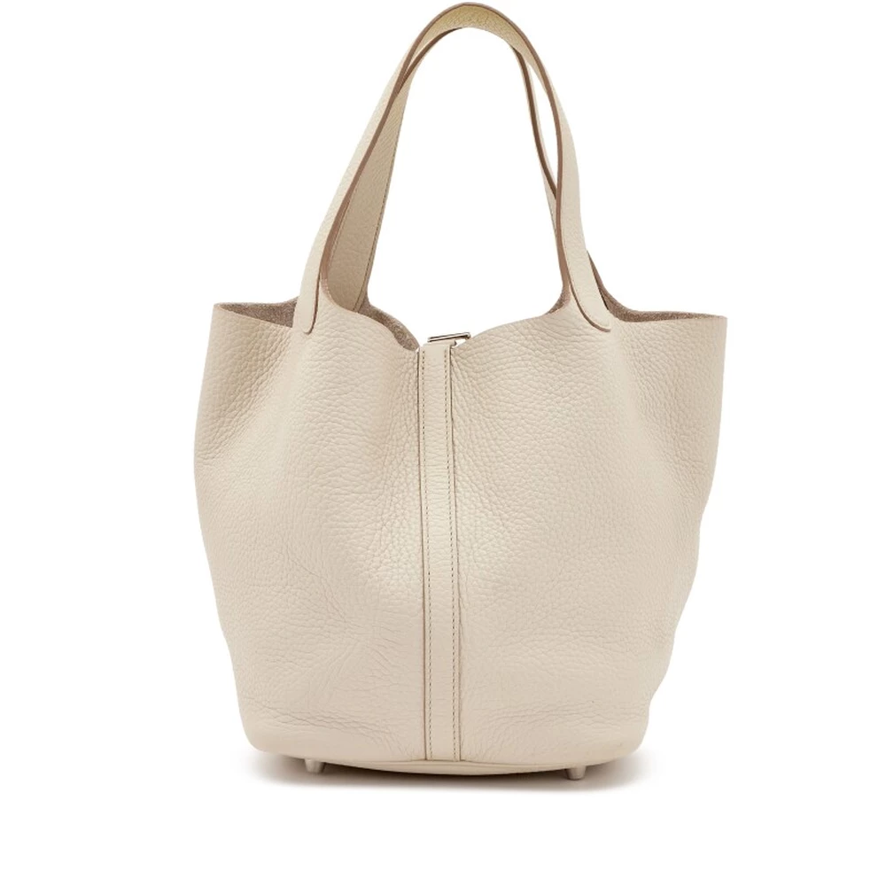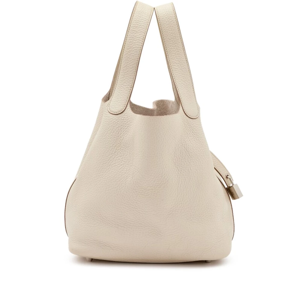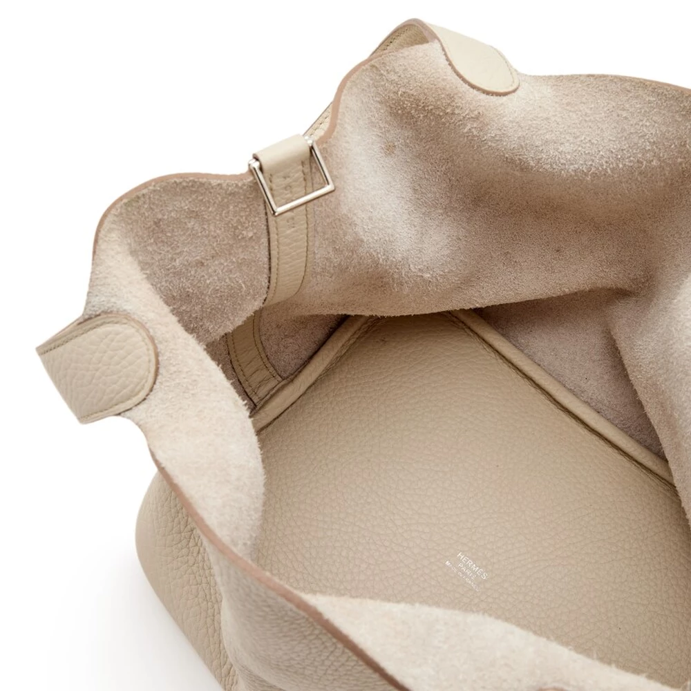 This Hermès Béton Clémence Picotin Lock 22 with Palladium Hardware is a neutral and spacious handbag in a soft, off-white shade. The relaxed Clémence leather enhances its casual-chic appeal, while the palladium hardware adds a modern touch. The 22 cm size provides ample space for essentials. This Picotin is an effortlessly sophisticated everyday bag.