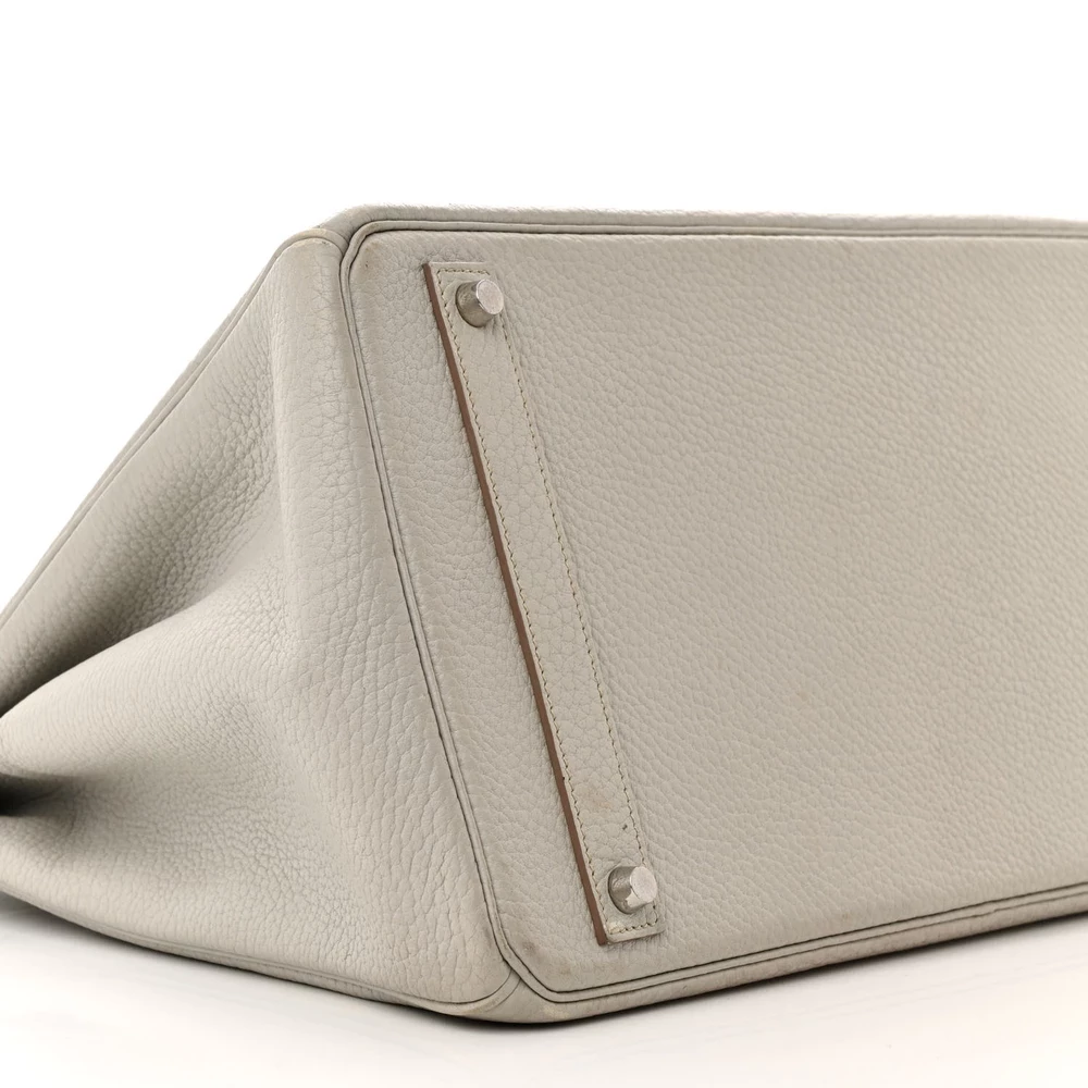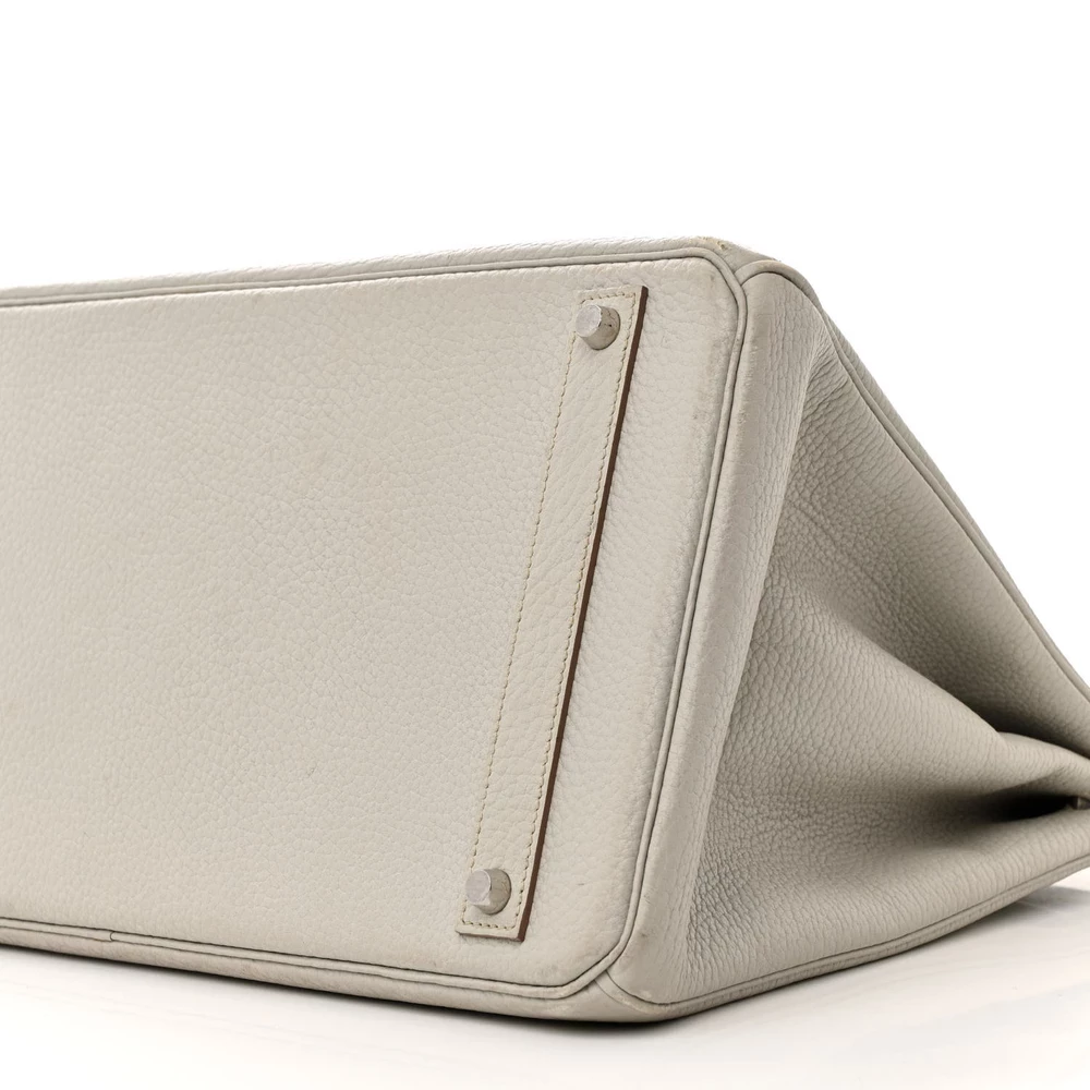 This Hermès Fjord Birkin 40 in Gris Perle is a refined and spacious handbag in a soft pearl gray hue. The Fjord leather has a natural matte finish with a slightly pebbled texture, offering durability and understated elegance. At 40 cm, this Birkin is ideal for those who appreciate a generous size without compromising sophistication. Palladium hardware adds a cool, modern contrast. This is a timeless and practical piece for collectors who love neutral tones.