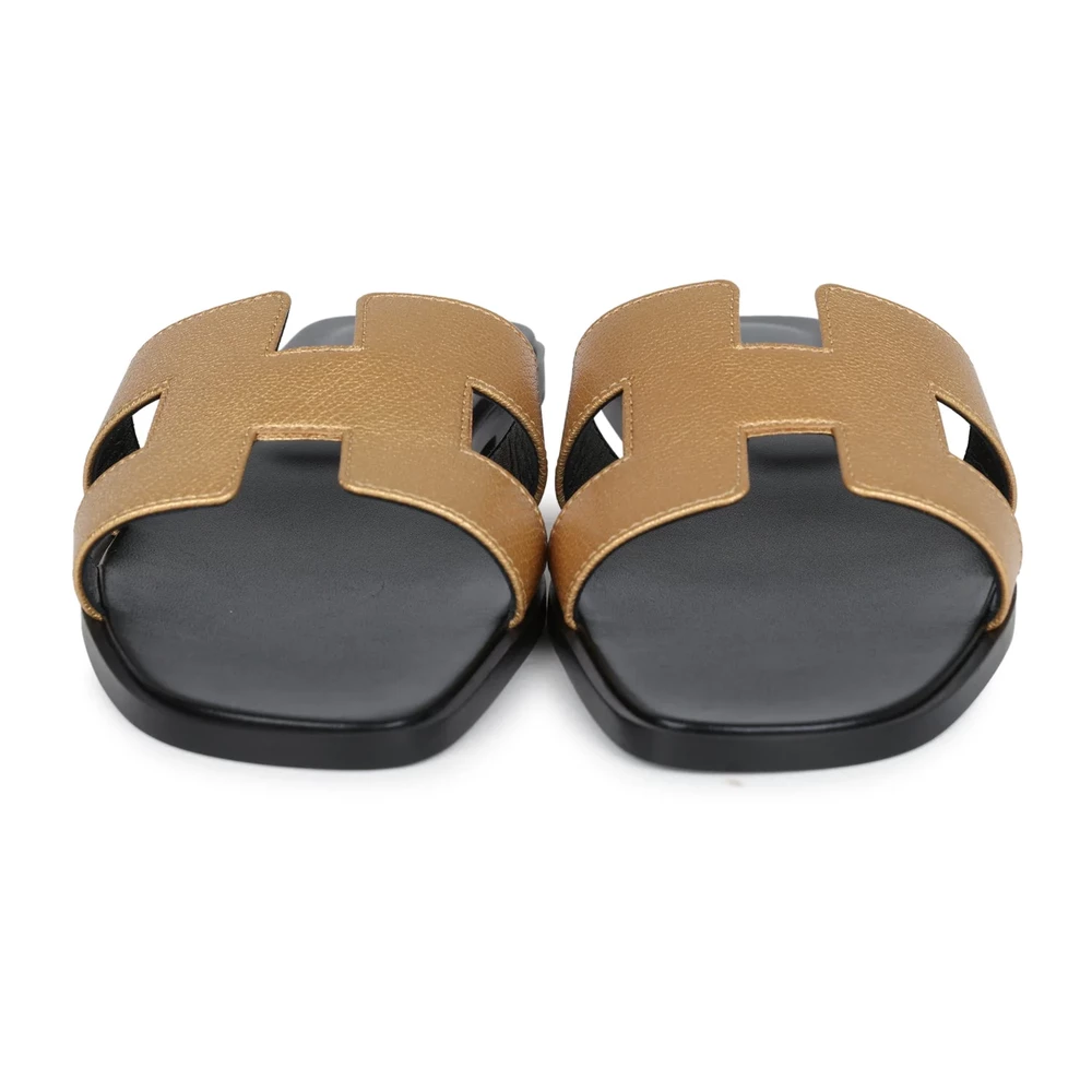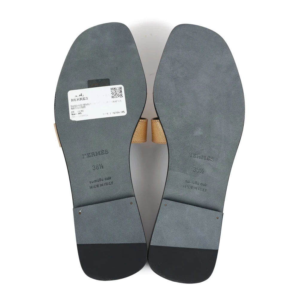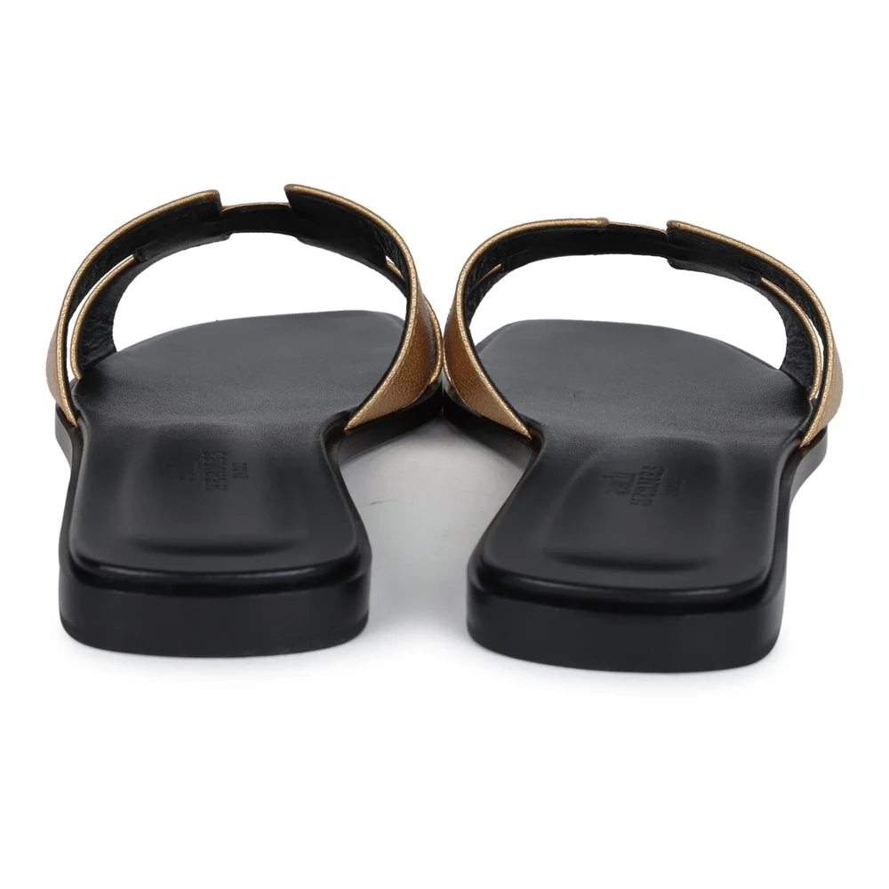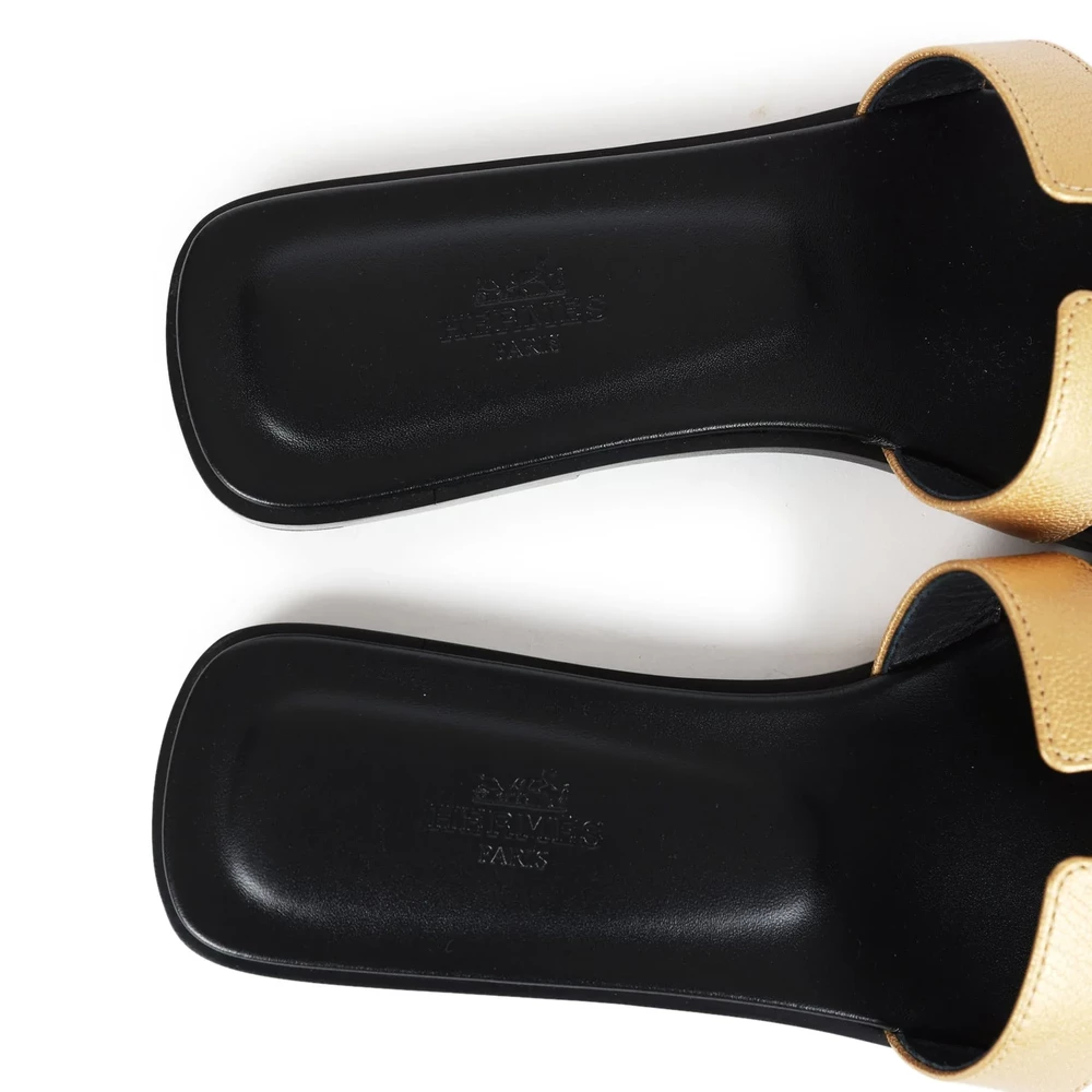 This Hermès Oran Sandal in Doré chèvre leather is a radiant take on the brand’s classic design. The shimmering gold hue adds a touch of glamour, while the smooth leather ensures a refined finish. The signature “H” cutout remains the focal point, enhancing its iconic appeal. The flat sole allows for comfortable wear throughout the day. This sandal is a perfect balance of sophistication and effortless style.