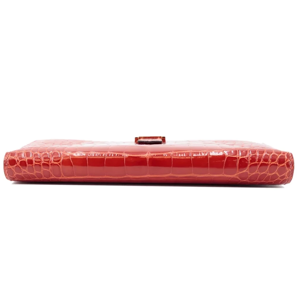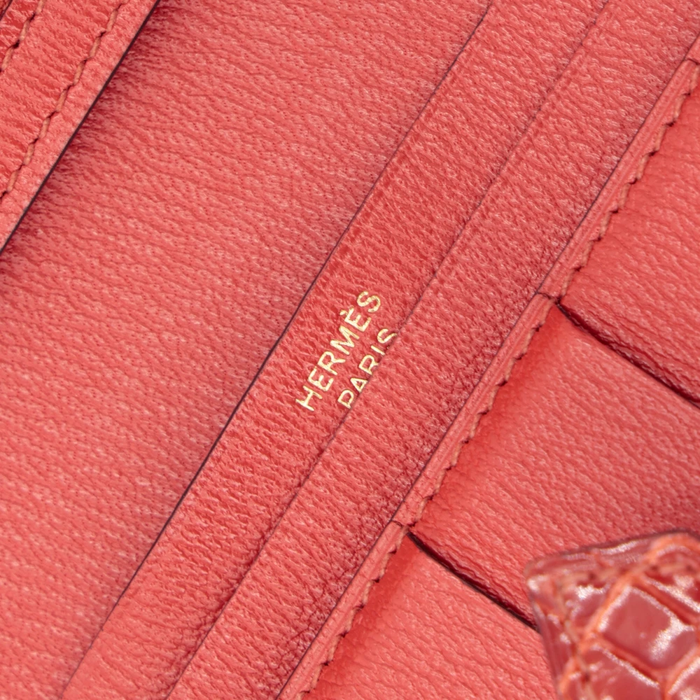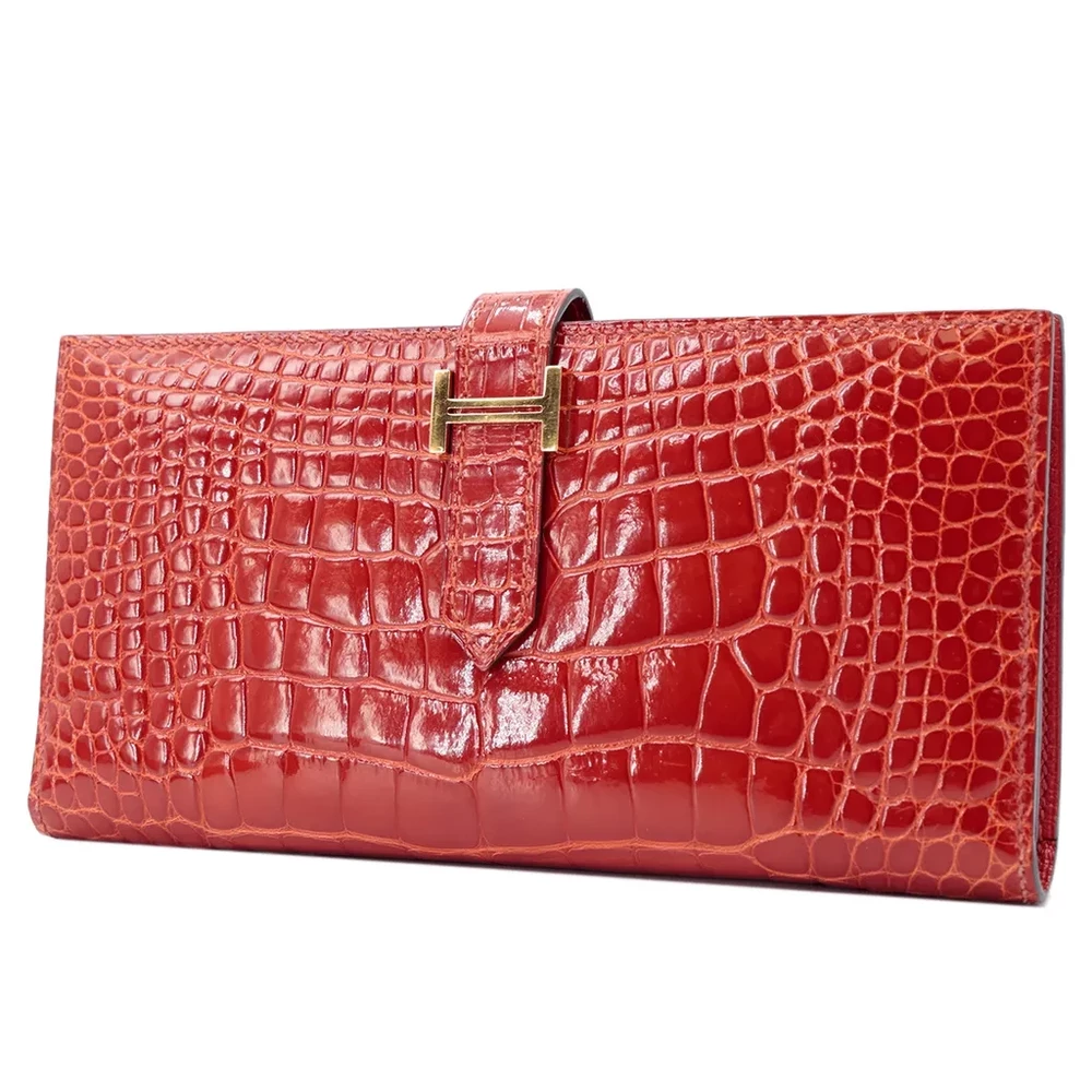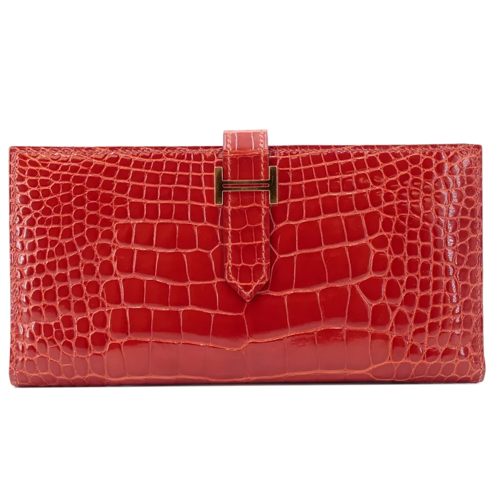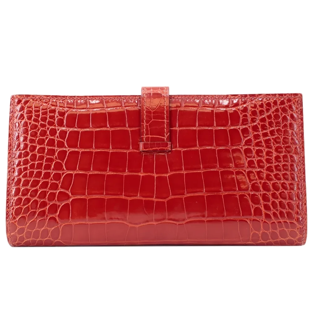 This Hermès Bearn long wallet in Sanguine (9M) is a striking and sophisticated accessory, crafted from luxurious alligator leather. The deep, warm red hue is complemented by elegant gold hardware, creating a timeless and refined aesthetic. Measuring approximately 17.5cm in width, 10cm in height, and 2cm in depth, it offers ample space for essentials while maintaining a sleek silhouette. Stamped with a Square R (2014) marking, this piece comes with its original box. Currently available in Hong Kong, it is a true statement of Hermès craftsmanship and elegance.