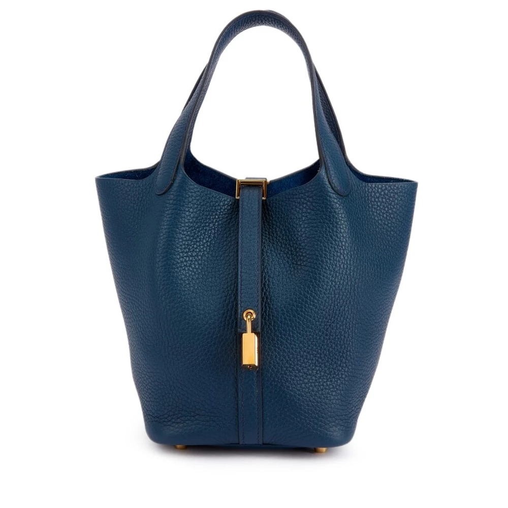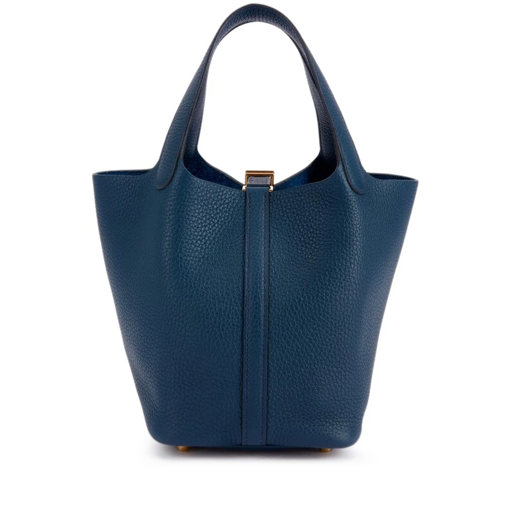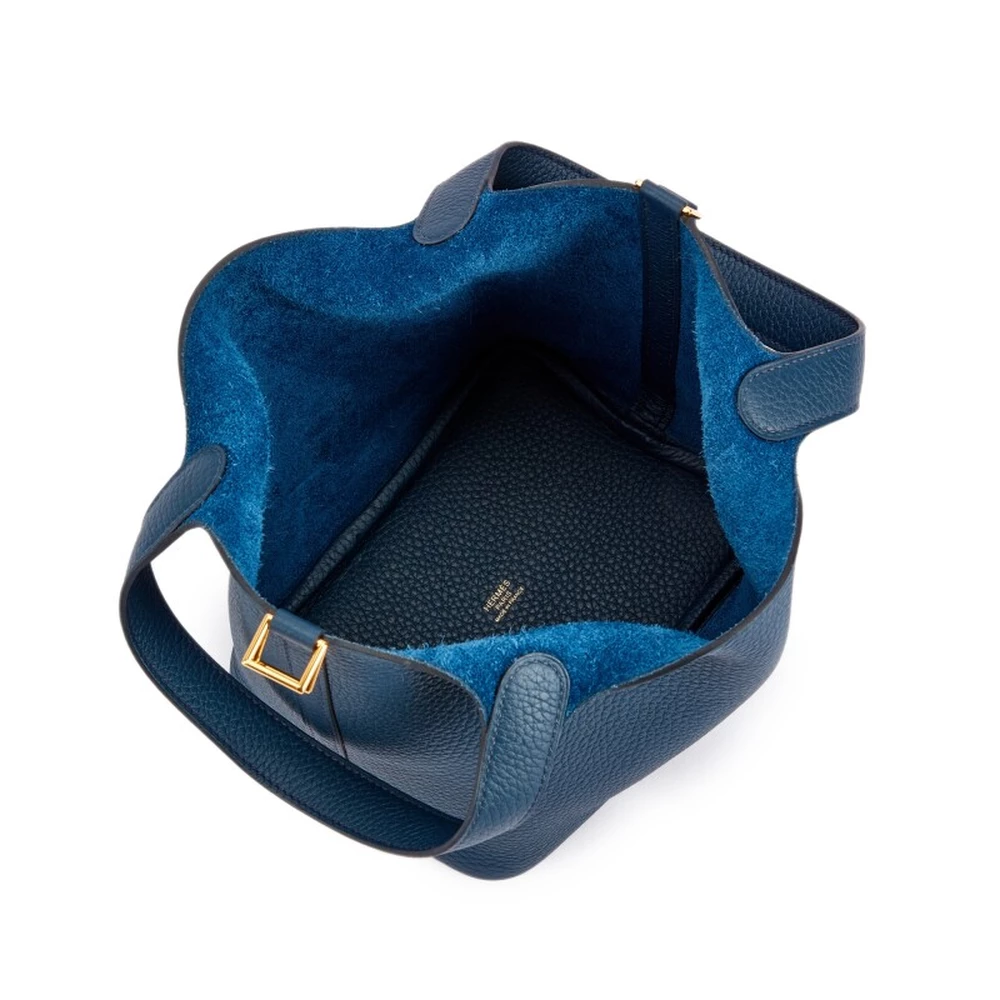 This Hermès Bleu de Prusse Clémence Picotin Lock 18 with Gold Hardware is a deep and rich blue handbag with a refined and structured look. The Clémence leather adds softness, while the gold-plated hardware enhances its timeless appeal. The bucket-style design makes it both functional and effortlessly stylish. This Picotin is a sophisticated statement piece in a versatile color.