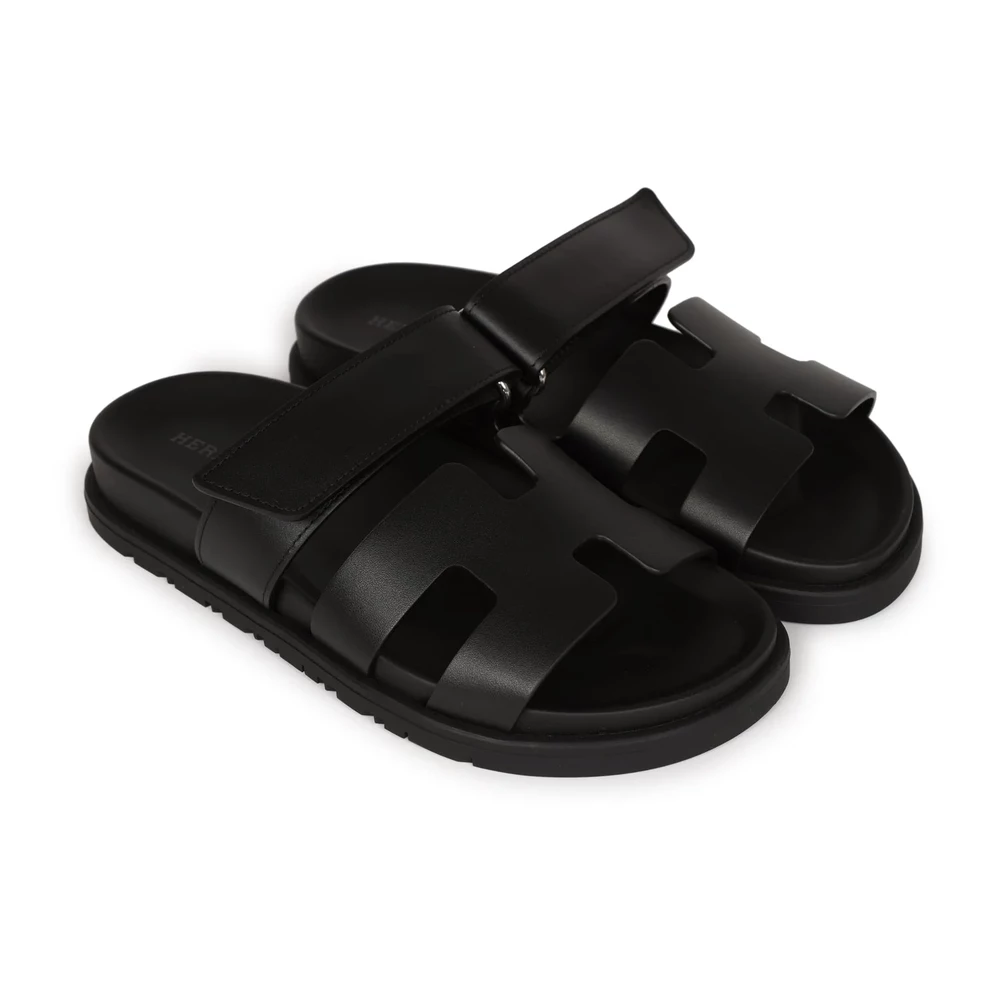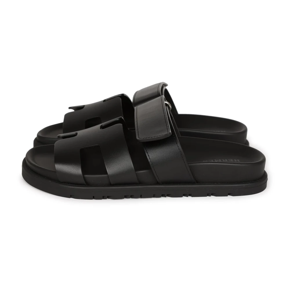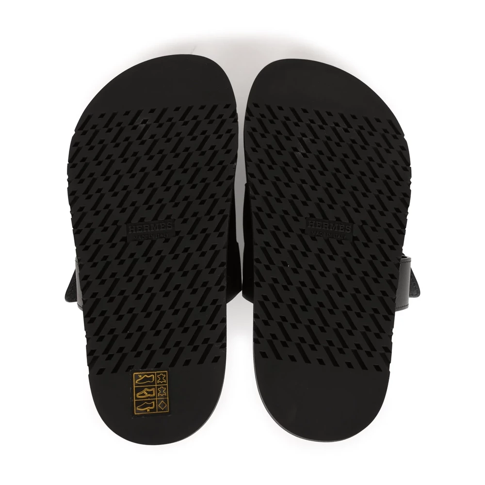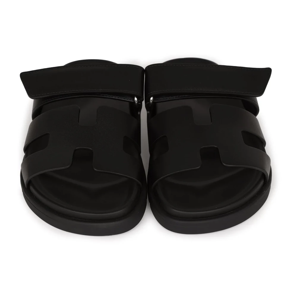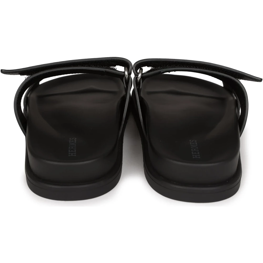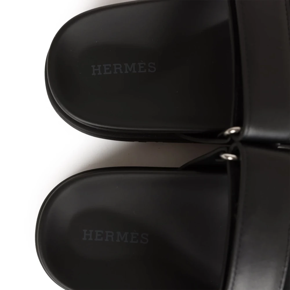 This Hermès Chypre Techno sandal in black calfskin with palladium hardware is a refined and modern footwear choice. The sleek black leather and metallic hardware create a sophisticated contrast. Featuring an ergonomic sole and adjustable strap, this sandal is perfect for those who appreciate luxury with an urban edge.