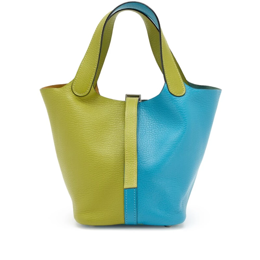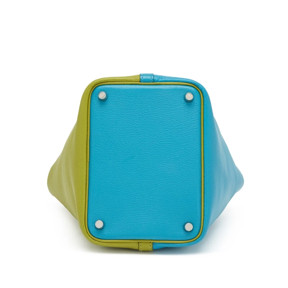 This Hermès Vert Anis and Turquoise Chevre Picotin Lock 18 PM is a rare and playful handbag featuring a striking mix of green and turquoise. The Chevre leather offers a smooth and slightly structured feel, adding a luxurious touch. The Picotin Lock 18 PM’s compact size makes it a unique and stylish companion. Palladium hardware enhances its fresh and lively color combination. This Picotin is a collector’s dream for those who love vibrant hues.