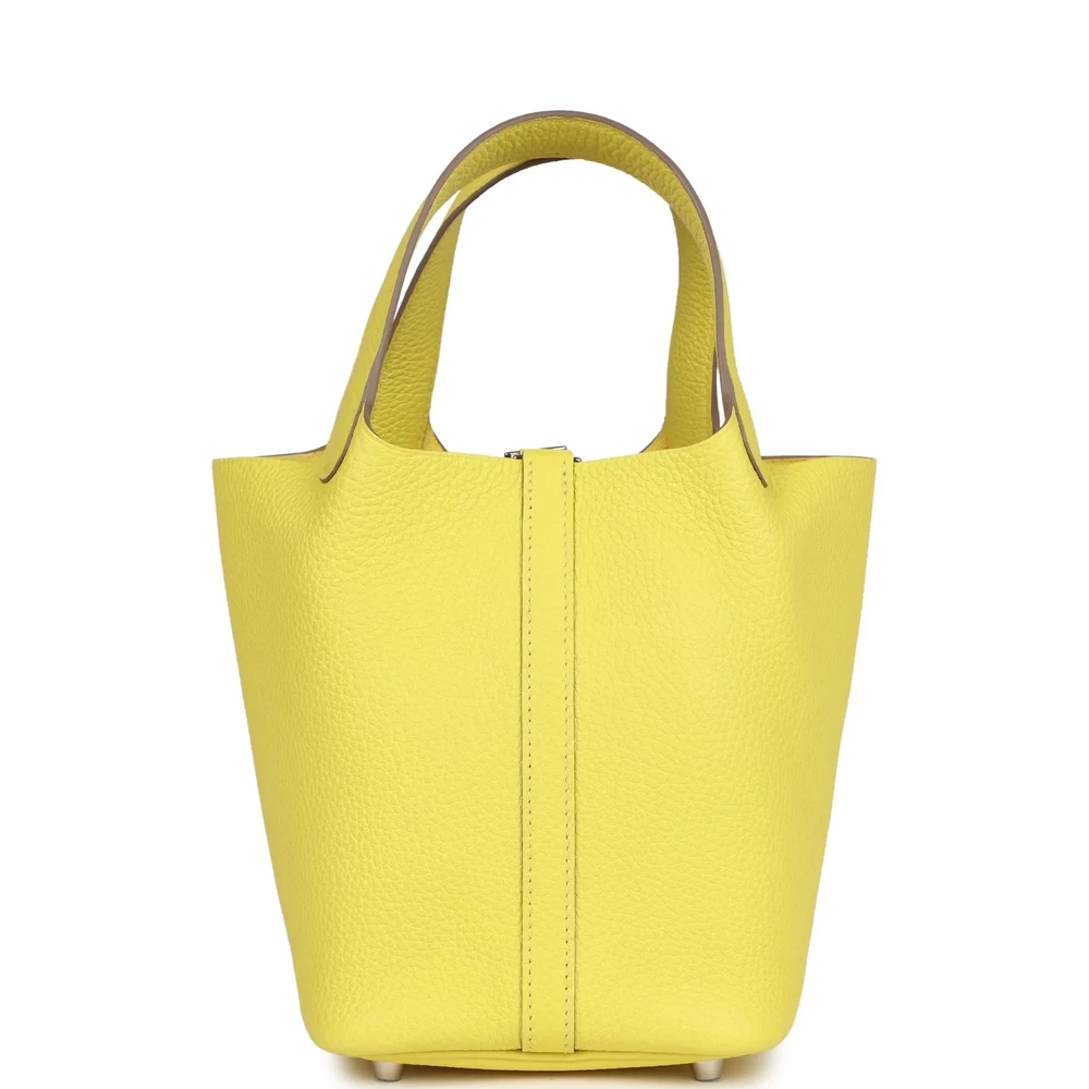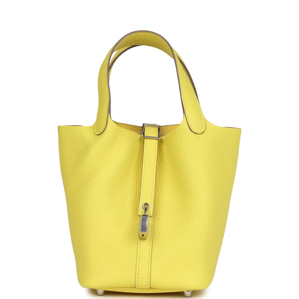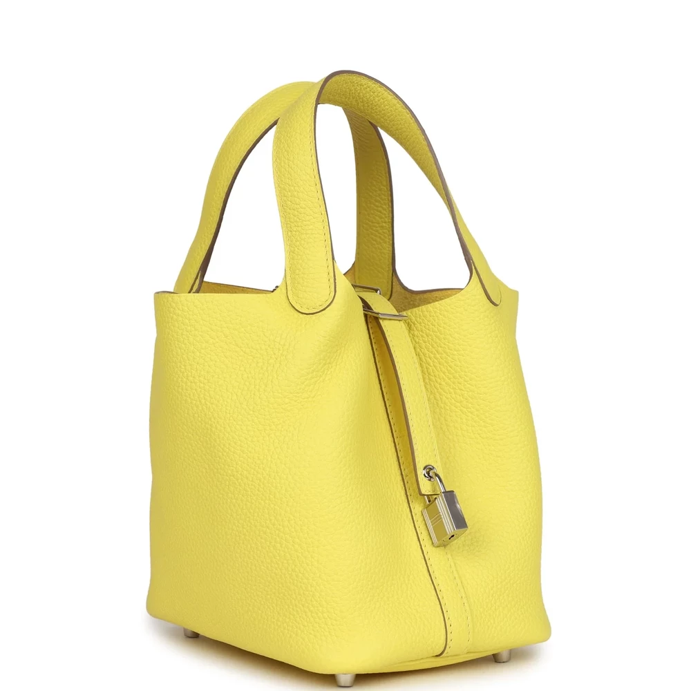 This Hermès Picotin Lock 18 Lime Clémence with Palladium Hardware is a vibrant and energetic handbag in a bright citrus green. The soft Clémence leather adds to its effortless charm, while the palladium hardware keeps it sleek and contemporary. The bucket-style design makes it a perfect everyday companion. This Picotin is a bold and stylish addition for those who love playful colors.