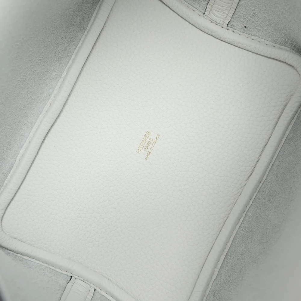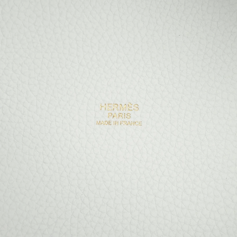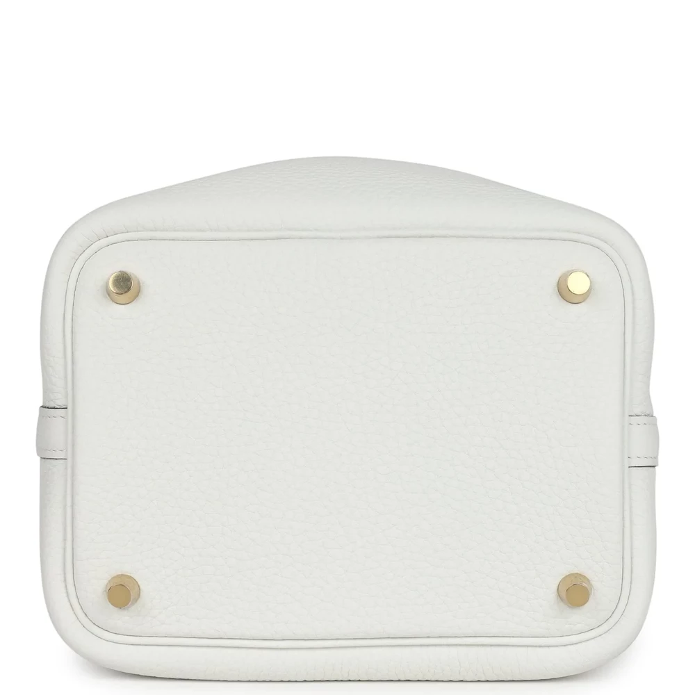 This Hermès White Clémence Picotin Lock 18 with Gold Hardware is a pristine and elegant handbag in a soft, milky white hue. The grained Clémence leather enhances its relaxed silhouette, while the gold hardware adds a warm, luxurious contrast. The bucket-style design ensures both versatility and sophistication. This Picotin is a refined and timeless statement of effortless luxury.