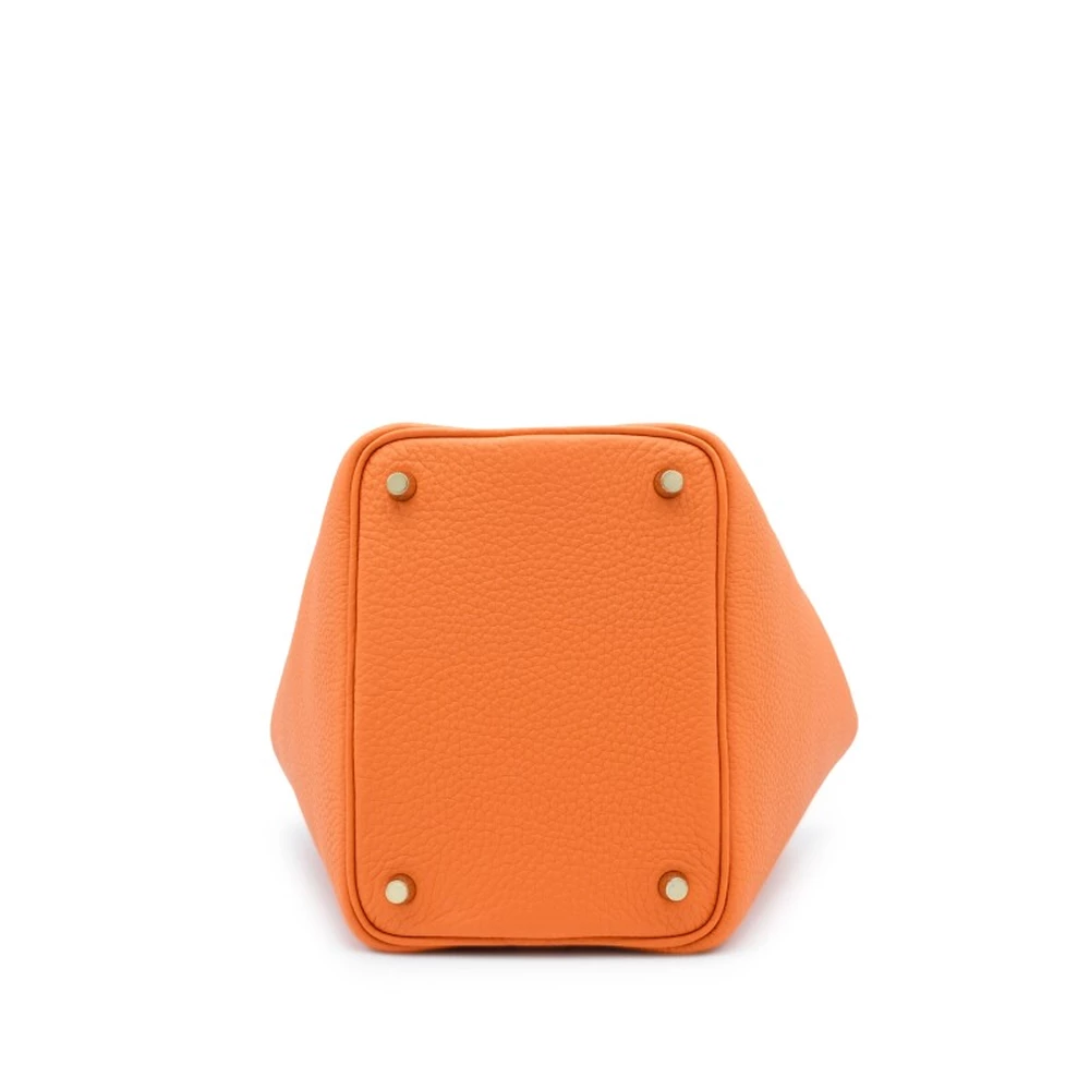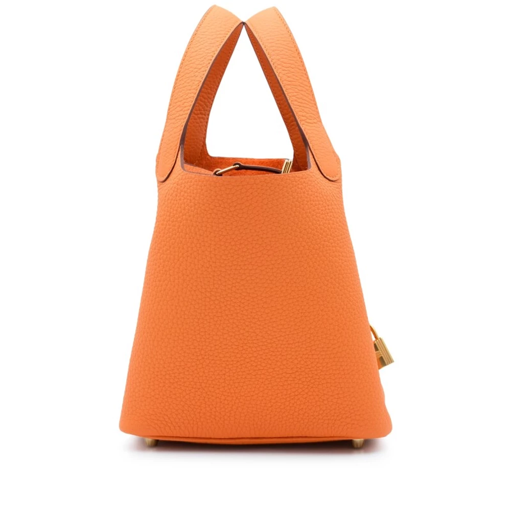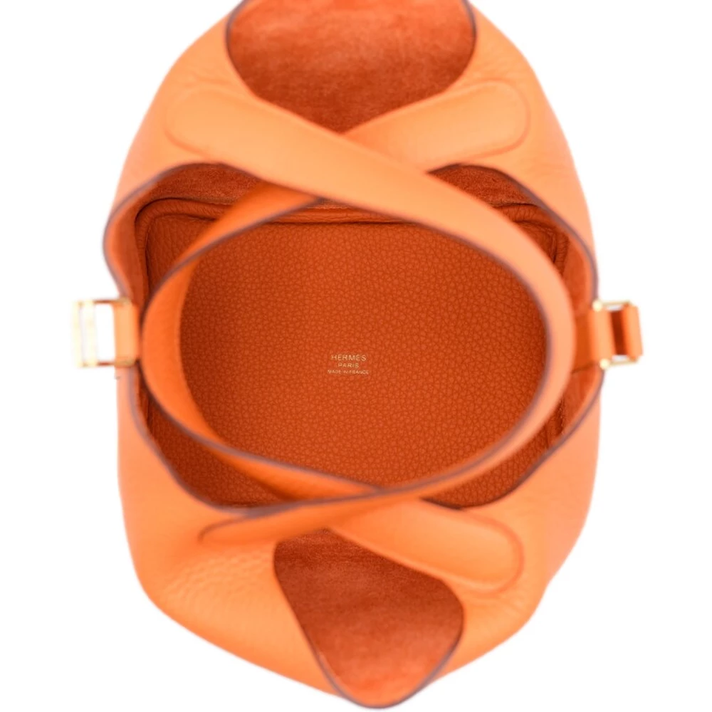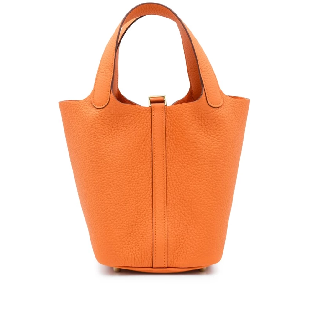 This Hermès Orange Clémence Picotin Lock 18 with Gold Hardware is a vibrant and energetic handbag in the house’s signature orange hue. The supple Clémence leather adds a casual elegance, while the gold-plated hardware enhances its warm, rich aesthetic. The bucket-style design offers both versatility and sophistication. This Picotin is a lively and statement-making addition to any collection.