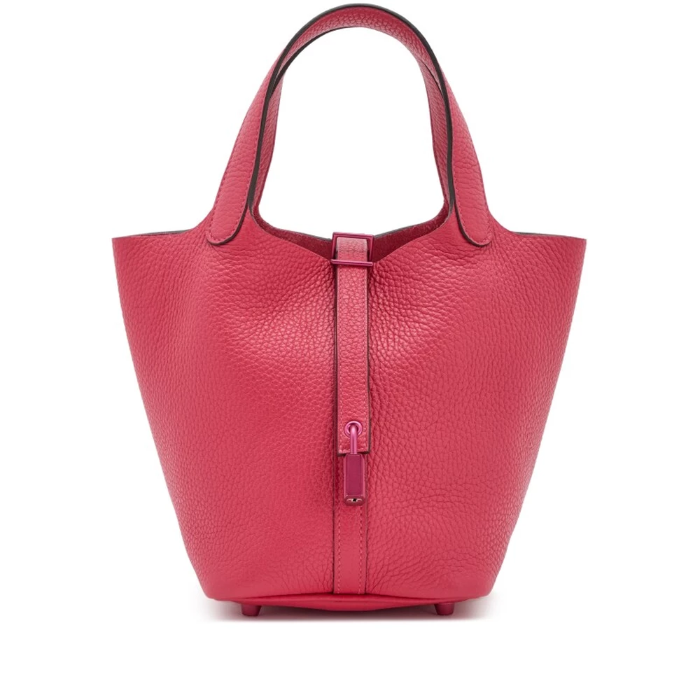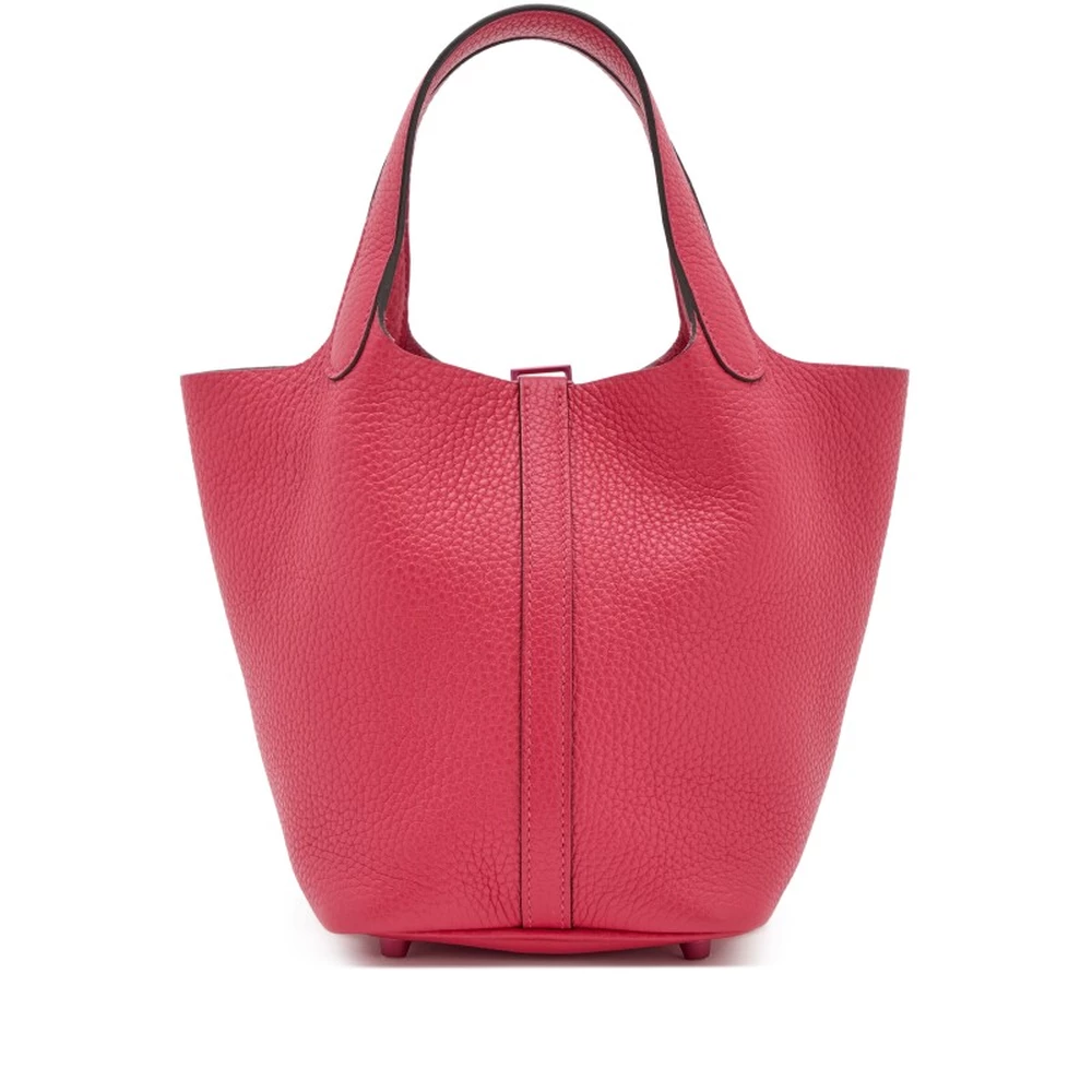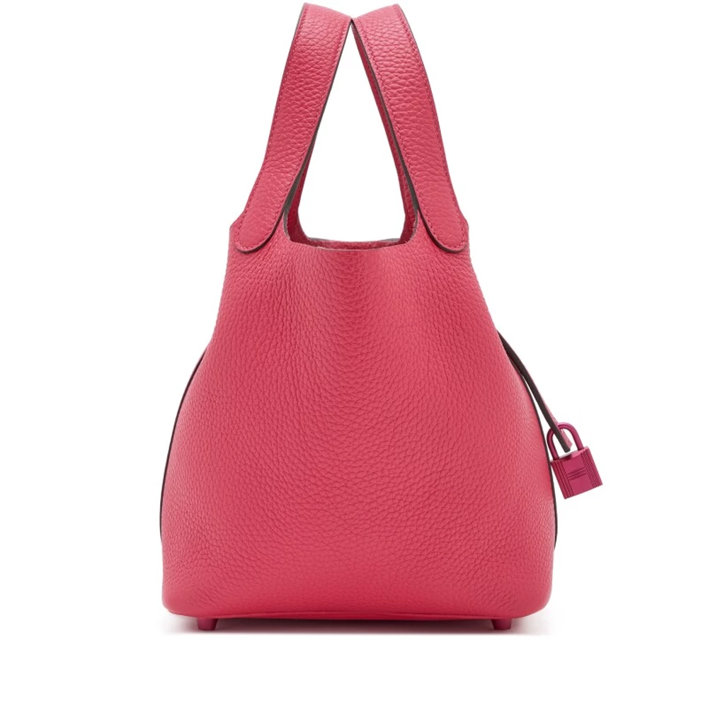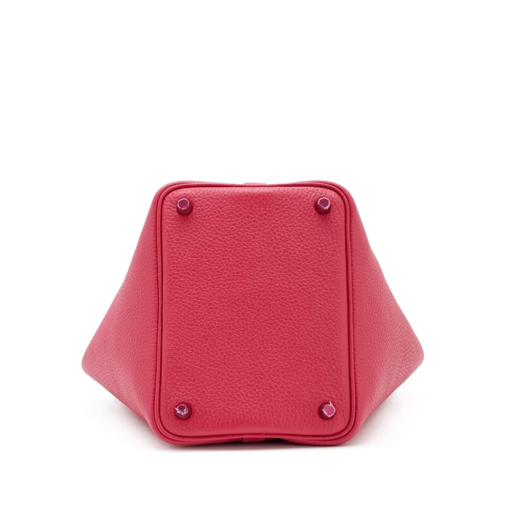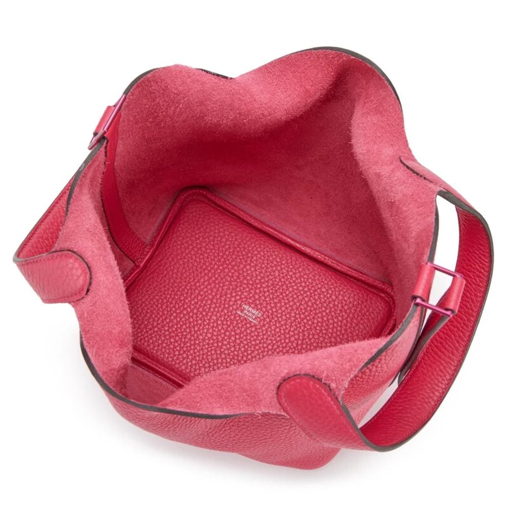 This Hermès Rose Mexico Clémence Monochrome So Pink Picotin Lock 18 with Pink Hardware is a vibrant and playful handbag in a striking shade of pink. The monochrome pink hardware adds a modern twist, creating a cohesive and bold aesthetic. The Clémence leather ensures a soft, luxurious feel. This Picotin is a statement accessory for those who love bright and cheerful colors.