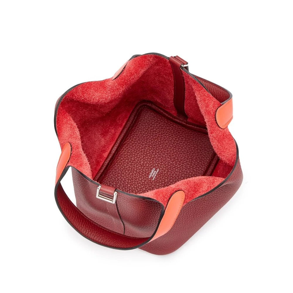 This Hermès Rouge H Clémence and Orange Field Swift Verso Picotin Lock 18 with Palladium Hardware is a striking and unique handbag featuring a deep red exterior with a contrasting orange interior. The combination of Clémence and Swift leather provides both structure and smoothness. The palladium hardware adds a sleek modern edge. This Picotin is a bold and artistic take on a classic silhouette.