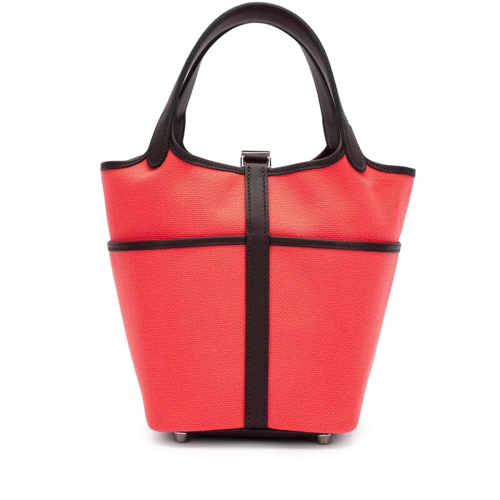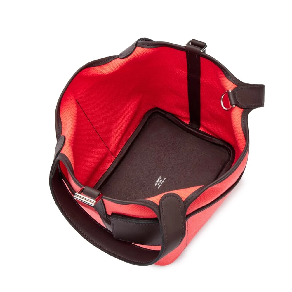 This Hermès Rouge Sellier Swift and Rose Texas Toile Goéland Cargo Picotin Lock 18 with Palladium Hardware is a striking and practical handbag featuring a combination of smooth Swift leather and sturdy Toile fabric. The deep Rouge Sellier hue contrasts beautifully with the warm Rose Texas accents, while the cargo pockets add a functional edge. The palladium hardware provides a sleek and modern finish. This Picotin is a perfect blend of rugged utility and refined elegance.
