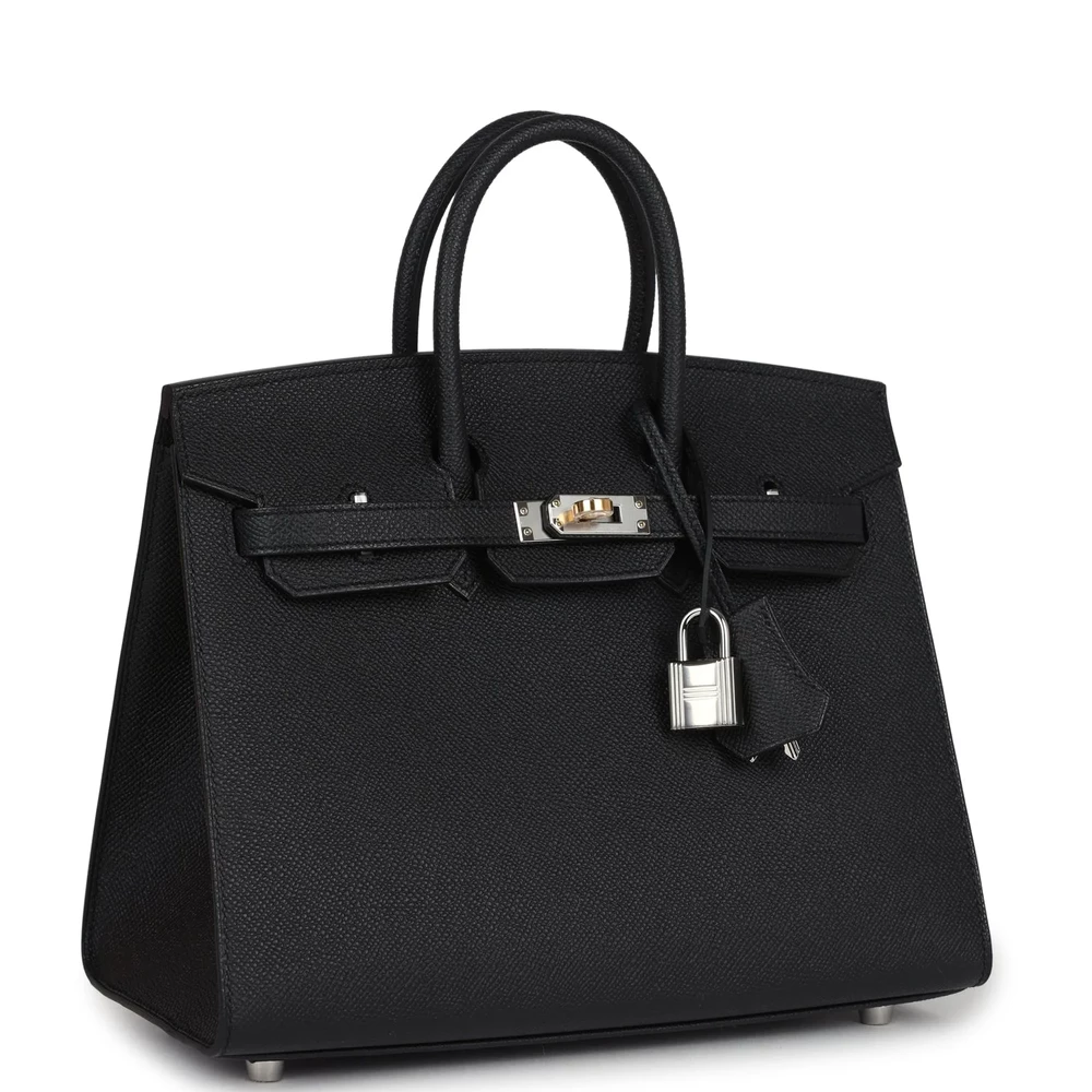 This Hermès Sellier Birkin 25 is made from black Epsom leather with electrum hardware, showcasing tonal stitching, a front flap with two straps and a center toggle closure, a clochette with lock and two keys, and double rolled handles. The interior is lined with black chèvre leather and offers one zip pocket with an Hermès engraved zipper pull and an open pocket on the opposite side. The electrum hardware adds a unique and refined touch to this stylish bag. The 25 cm size is perfect for those who prefer a smaller yet functional Birkin. The Epsom leather gives the bag a structured and durable finish.
