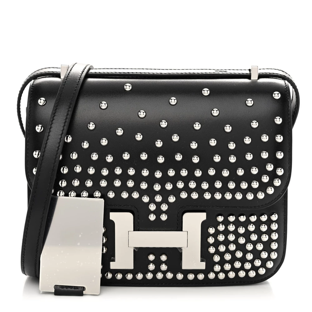 This Hermès Box Studded Clouté Constance 18 Black is a striking and edgy handbag featuring intricate stud detailing on smooth Box leather. The deep black shade enhances its timeless appeal, while the structured 18cm silhouette ensures elegance. The Clouté embellishments add a modern and artistic touch. Gold hardware provides a refined contrast to its bold aesthetic. This Constance is a statement piece that blends classic luxury with contemporary design.