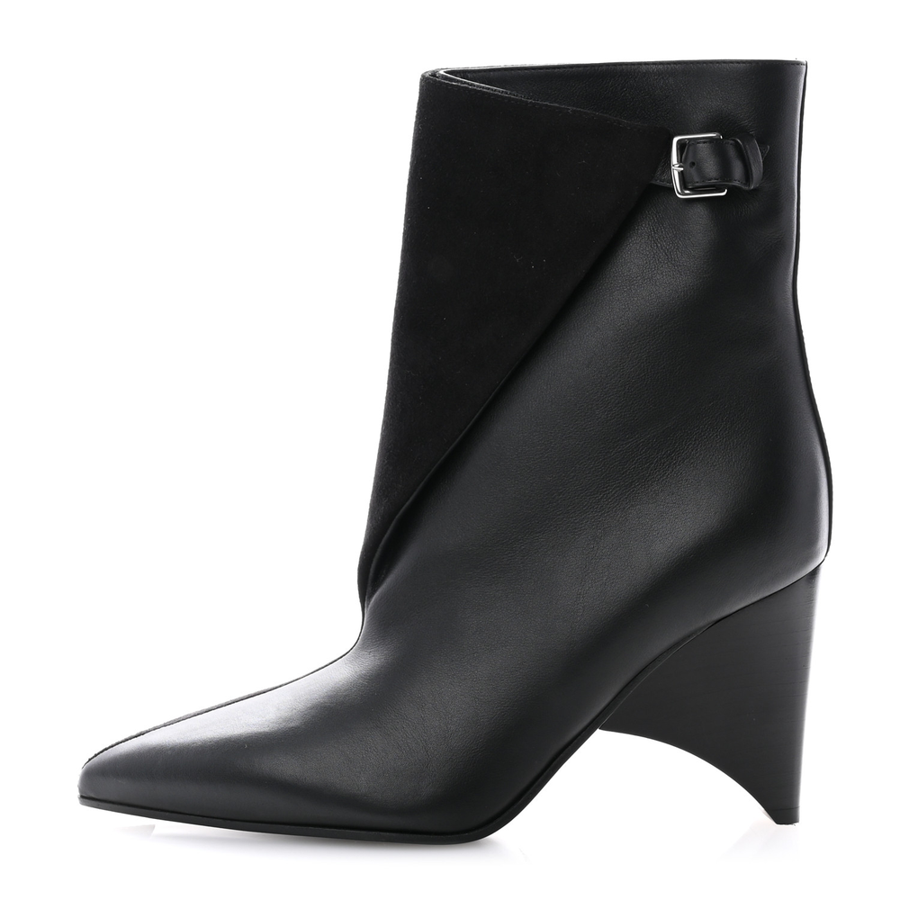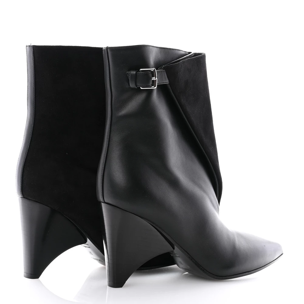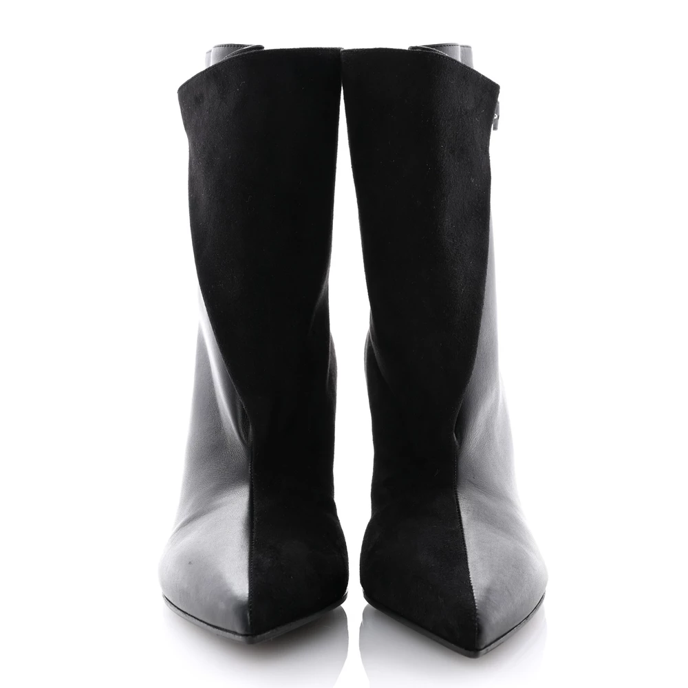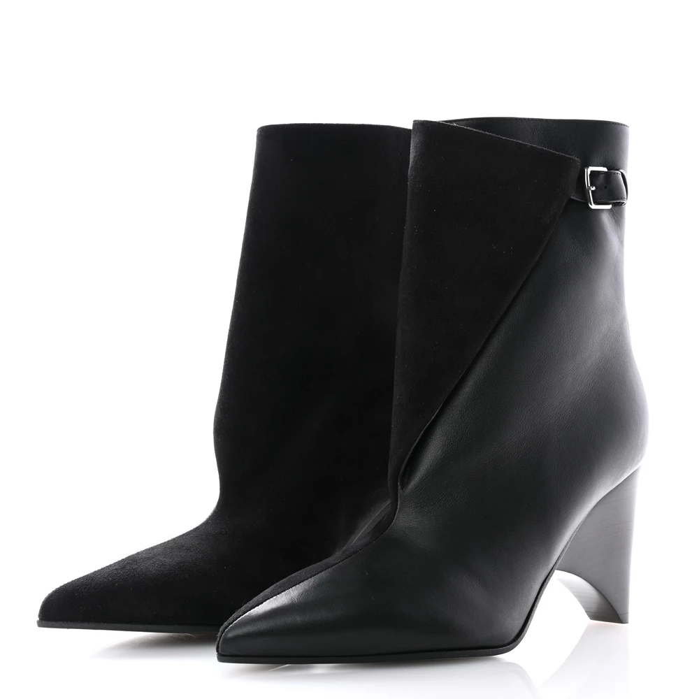 This Hermès Hanae 85 ankle boot in black Suede & Goatskin and calfskin is a chic and modern statement piece. The combination of soft suede and smooth calfskin creates a refined contrast, while the 85mm heel adds height and sophistication. This boot is a perfect blend of elegance and contemporary style.