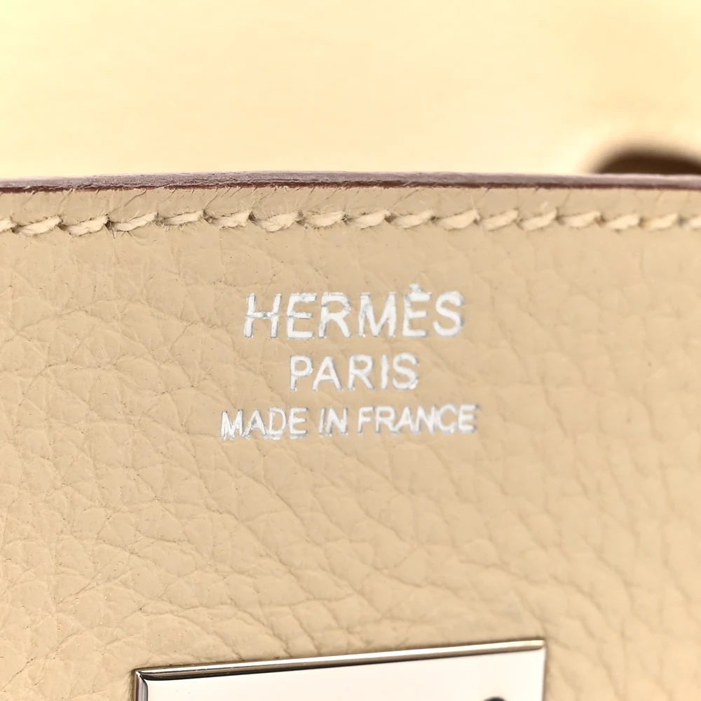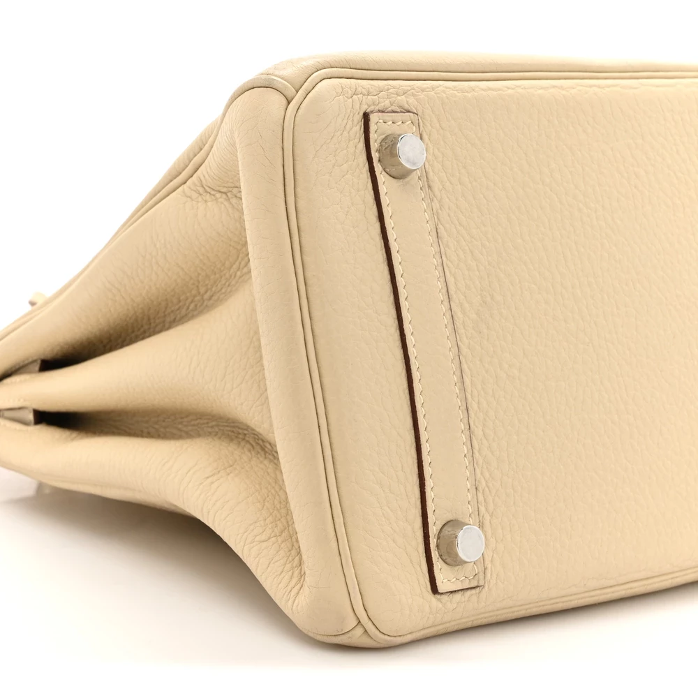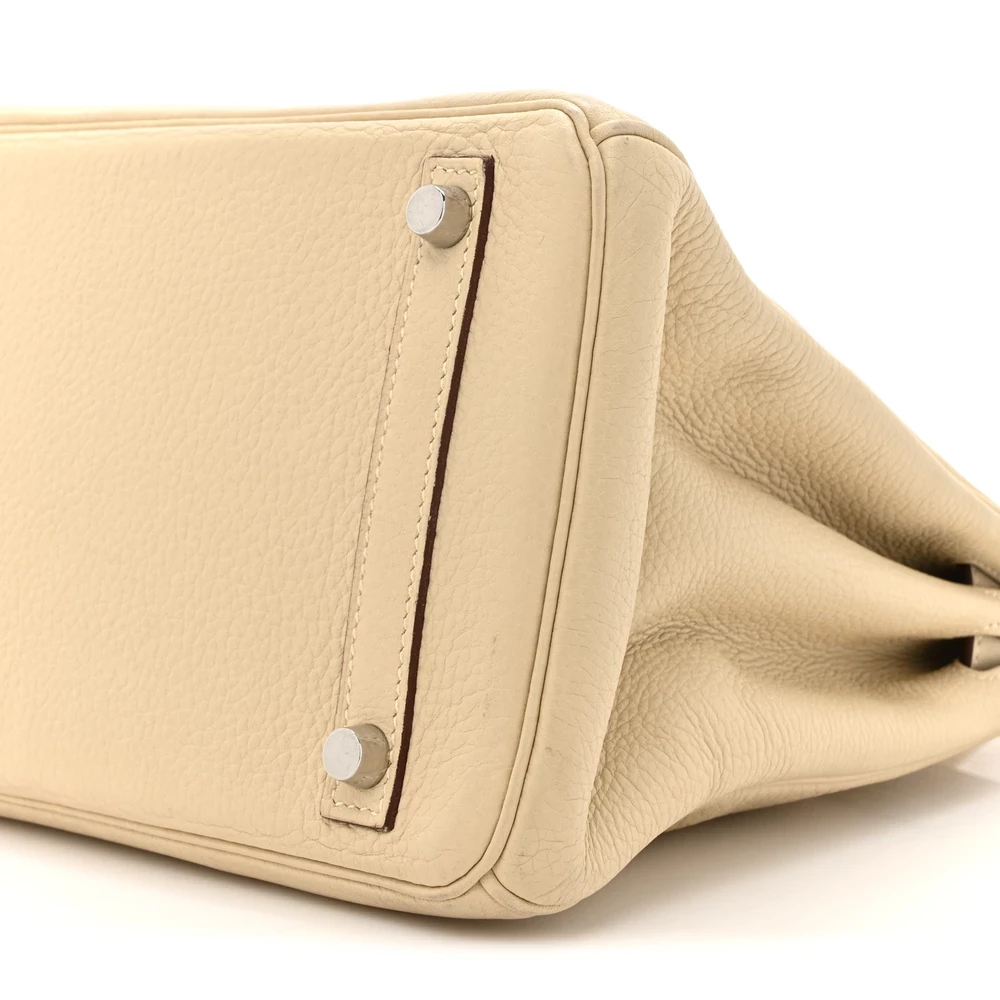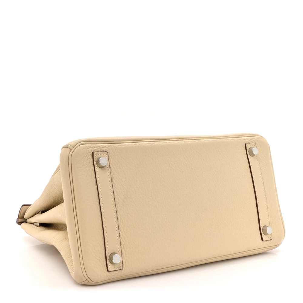 This Hermès Taurillon Clémence Birkin 30 in Parchemin is a refined and elegant handbag in a soft cream shade. The Clémence leather is known for its relaxed drape and slightly slouchy appearance. At 30 cm, this Birkin is both spacious and sophisticated, suitable for various occasions. The palladium hardware provides a crisp contrast to the warm neutral color. This is a timeless and effortlessly chic piece.