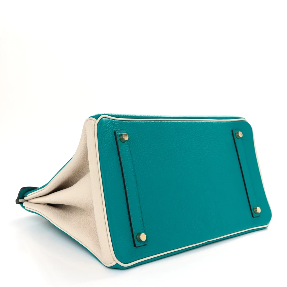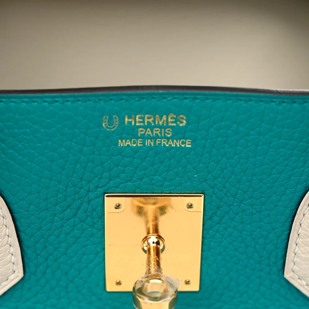 This Hermès Taurillon Clémence Horseshoe Birkin 35 in Bleu Paon & Béton is a highly exclusive, custom-order handbag featuring a striking two-tone combination. The rich teal shade of Bleu Paon contrasts beautifully with the soft, neutral Béton, creating a sophisticated and rare design. Crafted from Taurillon Clémence leather, it offers a slightly relaxed silhouette with a luxurious texture. Measuring 35 cm, it is spacious and ideal for daily elegance. Gold hardware adds a warm touch, completing this collector’s piece.