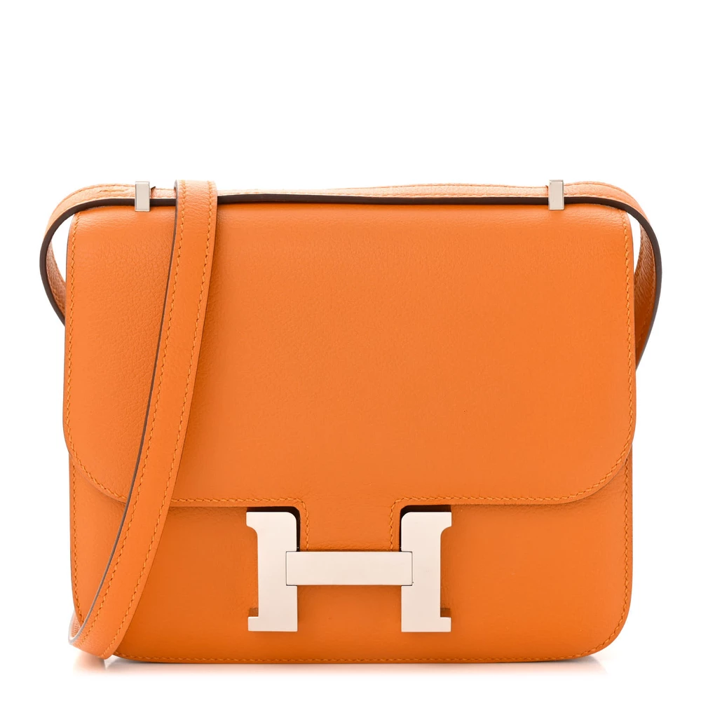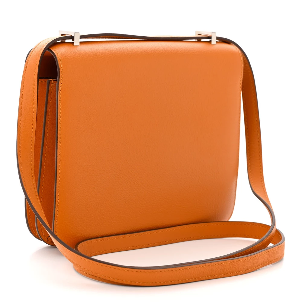 This Hermès Evercolor Verso Constance 18 Abricot Terre Battue is a refined and unique handbag with a warm apricot exterior and contrasting earthy tones inside. The Evercolor leather provides a soft and fine-grained texture, ensuring lasting beauty. The compact 18cm size makes it a sophisticated and stylish choice. Palladium hardware adds a sleek and modern touch. This Constance is a harmonious blend of elegance and contrast.