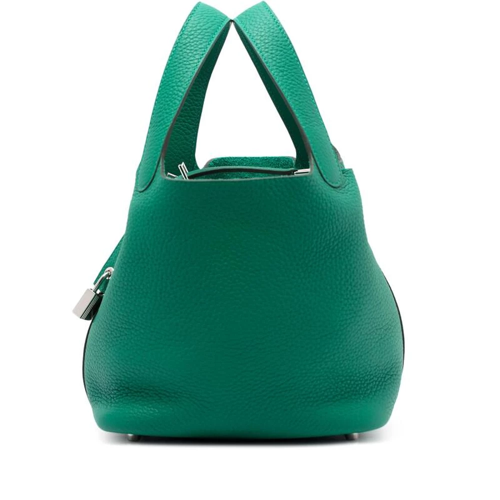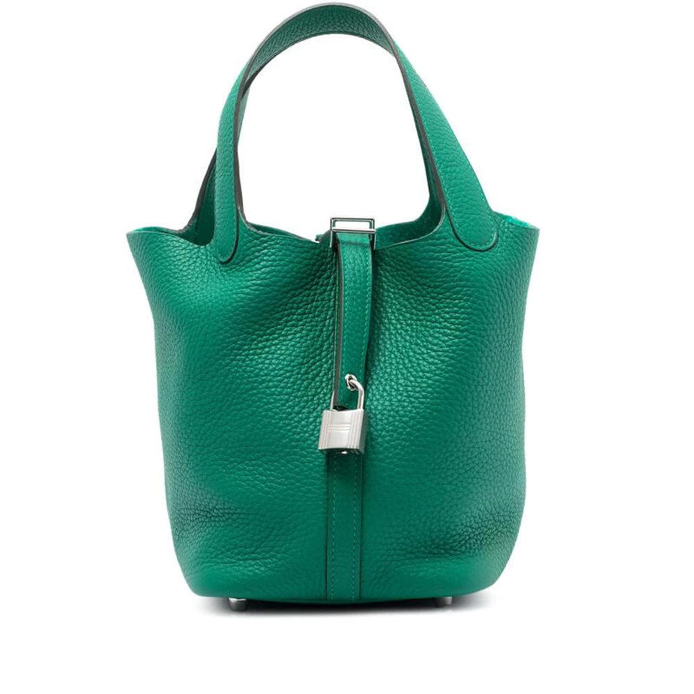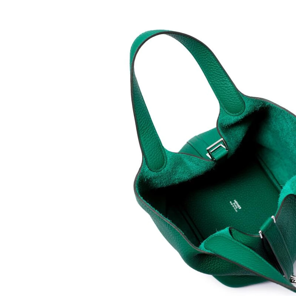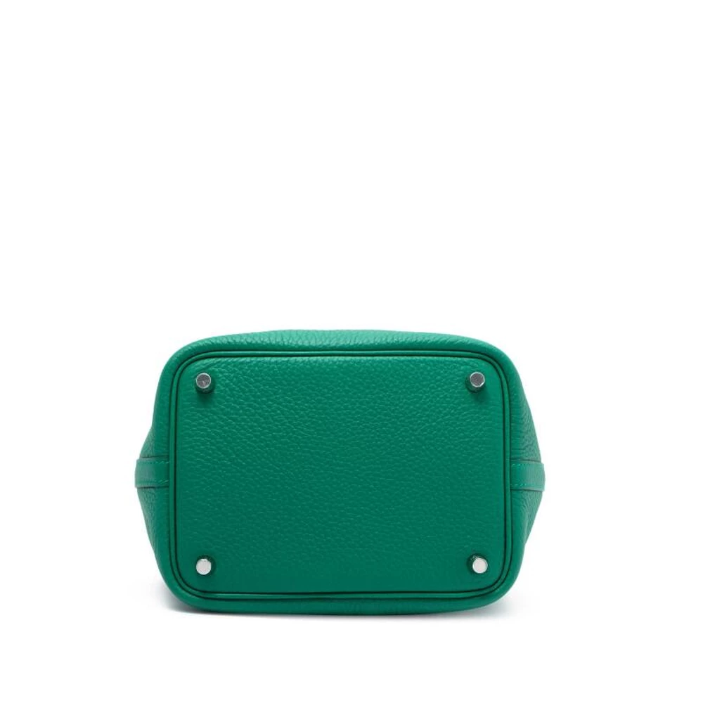 This Hermès Vert Vertigo Togo Picotin 18 with Palladium Hardware is a fresh and lively handbag in a deep, vibrant green. The structured yet supple Togo leather adds durability, while the palladium hardware provides a contemporary contrast. The bucket-style design makes it a versatile everyday bag. This Picotin is a bold and stylish choice for those who love rich, nature-inspired colors.