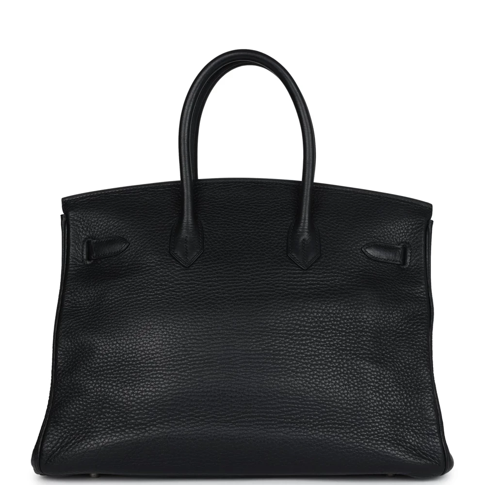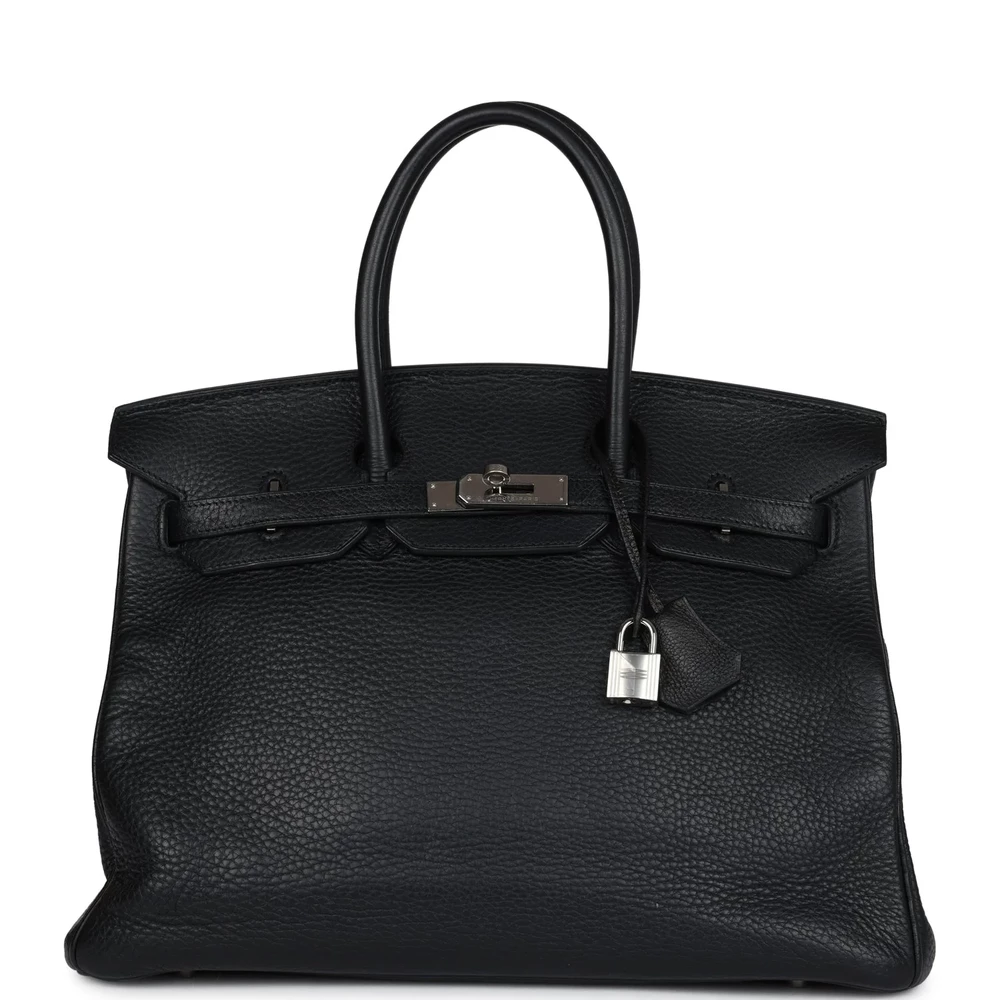 This Hermès Birkin 35 is crafted from black Clemence leather with palladium hardware, featuring tonal stitching, a front flap with two straps and a center toggle closure, a clochette with lock and two keys, and double rolled handles. The interior is lined with black chèvre leather and includes one zip pocket with an Hermès engraved zipper pull and an open pocket on the opposite side. The Clemence leather offers a supple and luxurious texture. This 35 cm Birkin is ideal for both work and leisure. The palladium hardware adds a modern touch to this vintage design.
