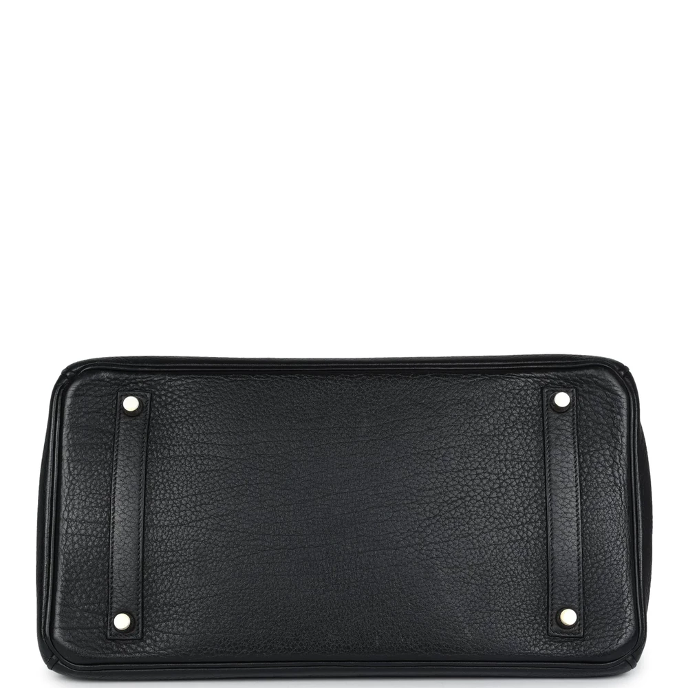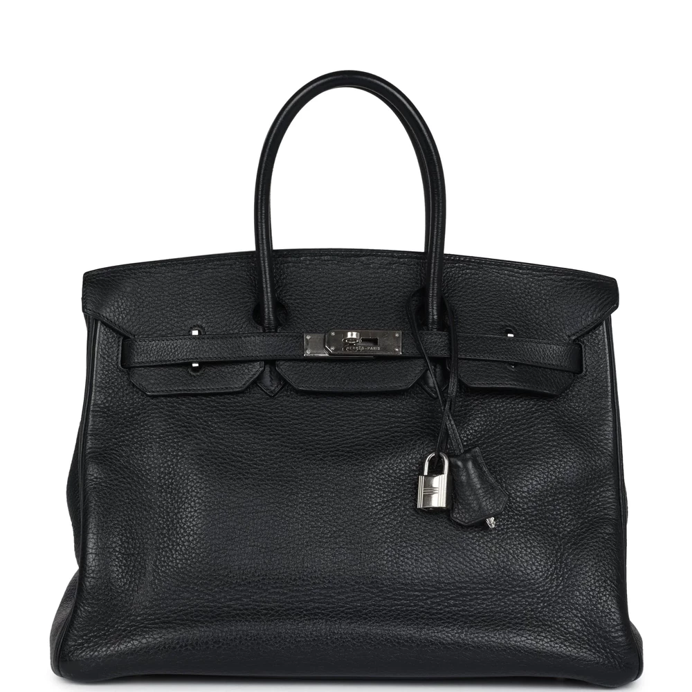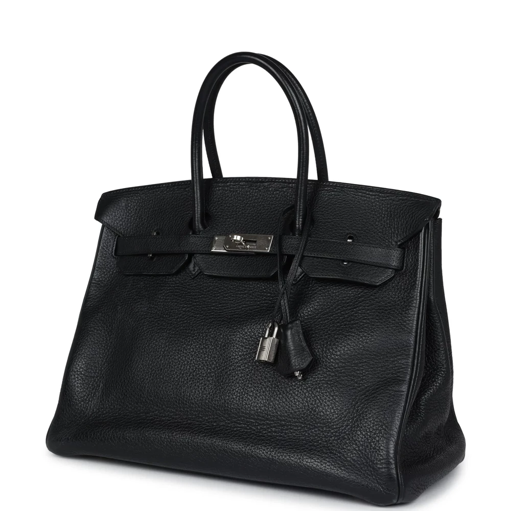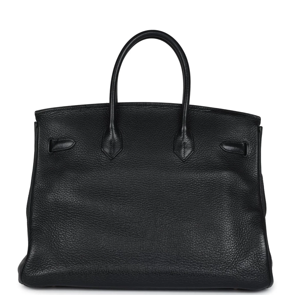 This Hermès vintage Birkin 35 is designed in black Togo leather with palladium hardware, featuring tonal stitching, a front flap with two straps and a center toggle closure, a clochette with lock and two keys, and double rolled handles. The interior is lined with black chèvre leather and includes one zip pocket with an Hermès engraved zipper pull and an open pocket on the opposite side. The black Togo leather is soft yet durable, making this a timeless classic. The 35 cm size is a perfect balance of size and practicality. The palladium hardware adds an elegant touch to the black leather.