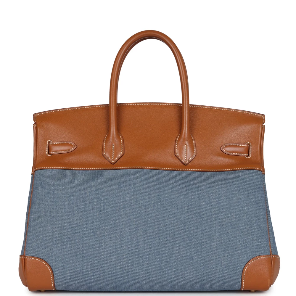 This Hermès vintage Birkin combines Blue denim and Gold Gulliver leather with gold hardware. It showcases contrast stitching, a front flap with two straps and a center toggle closure, a clochette with lock and two keys, and double rolled handles. The interior is lined with Gold chèvre leather and offers one zip pocket with an Hermès-engraved zipper pull and an open pocket on the opposite side. The unique combination of Blue denim and Gold Gulliver leather creates a sophisticated yet casual look. The gold hardware enhances the overall design, adding a touch of luxury to the bag. The spacious interior is perfect for everyday use.